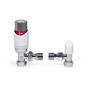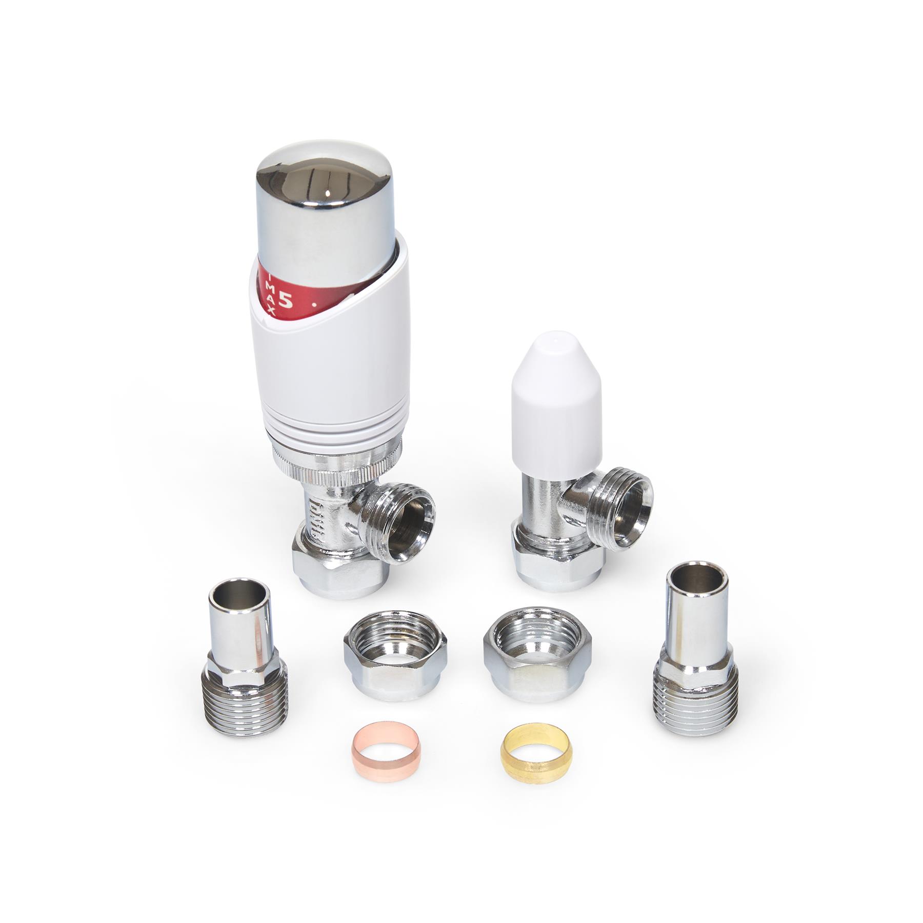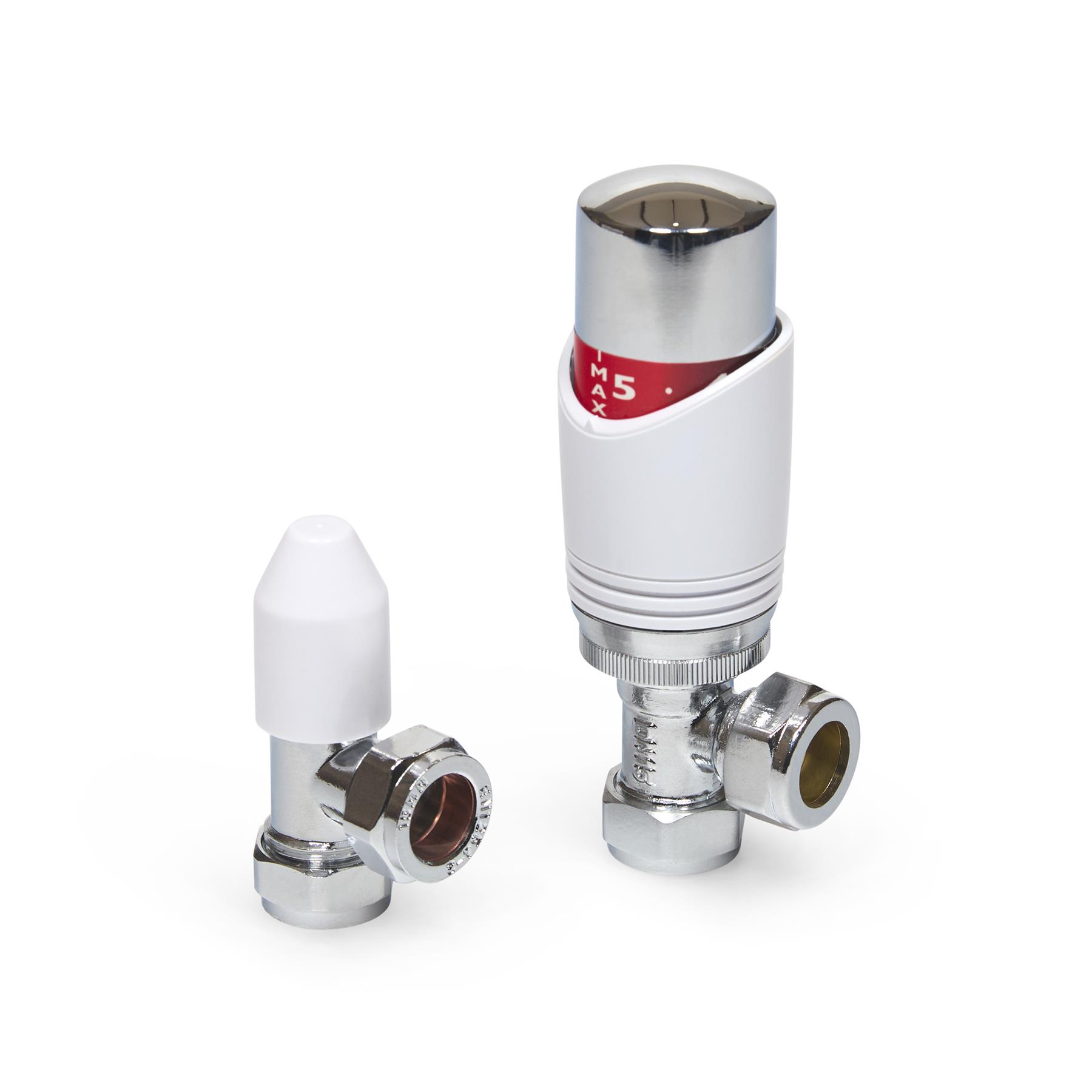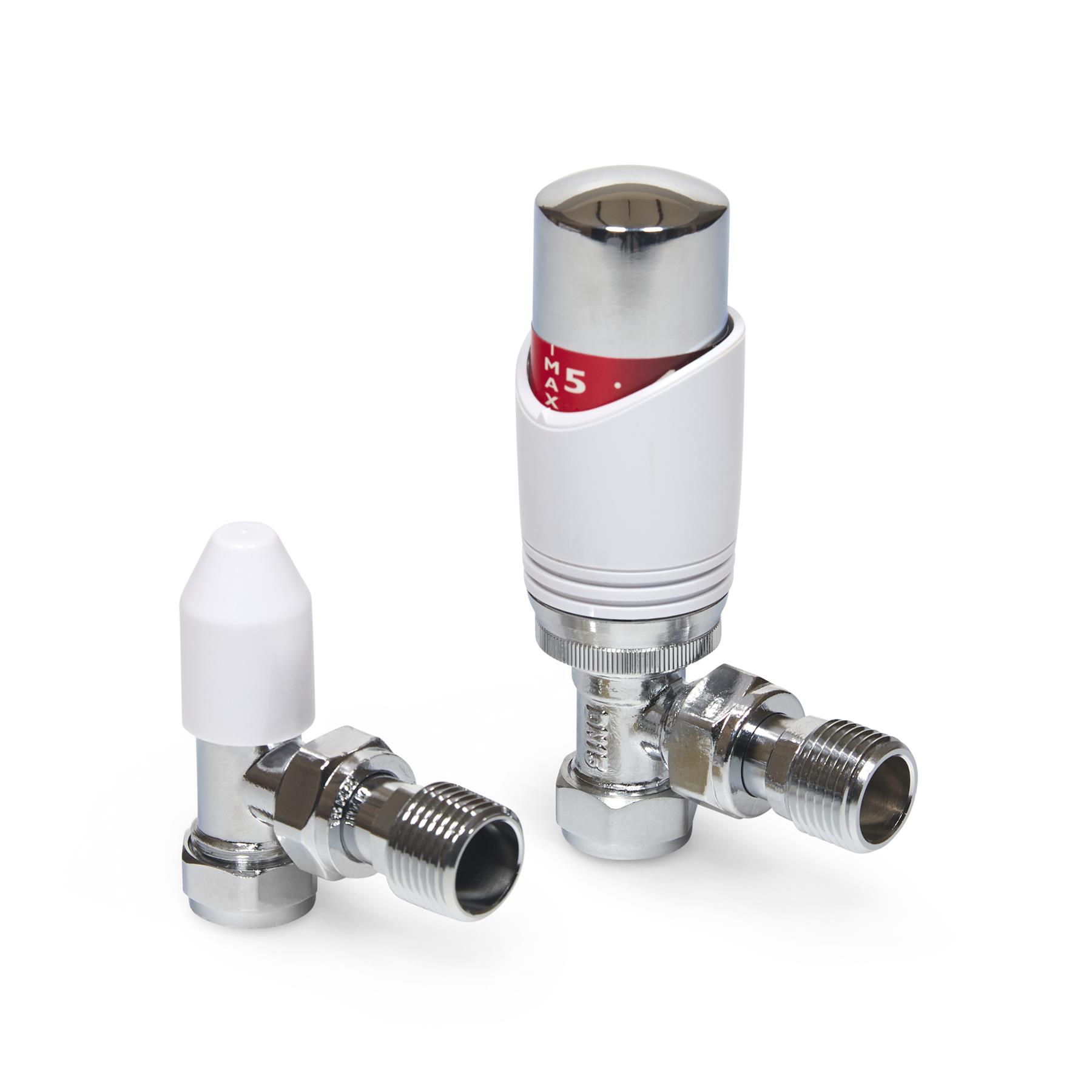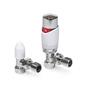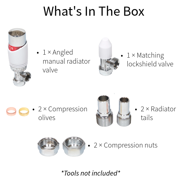 The LavaTap – Designer White & Chrome Angled Thermostatic Radiator Valve (TRV) & Lockshield Set offers a stylish and practical upgrade for central heating systems. Finished in polished chrome with a clean white head, it gives radiators a modern, premium look while providing reliable manual heating control. This angled radiator valve set fits 15 mm copper or plastic pipes with ½″ BSP radiator threads, the UK standard. It is not suitable for 8 mm or 10 mm microbore systems, or for radiators that require straight or corner valves without adapters. Checking compatibility before purchase helps avoid incorrect orders and ensures a proper fit. Each pack includes an angled TRV, matching lockshield, radiator tails, compression nuts, and olives – everything needed for a straightforward replacement or installation. The angled design suits radiators with floor pipework connecting into the side. Built from chrome-plated brass with a durable ABS head, this valve set is designed for long service life. By adjusting radiator output and balancing your system, it helps reduce wasted heat, improve efficiency, and cut down on energy bills while adding a sleek designer finish to your home heating.
