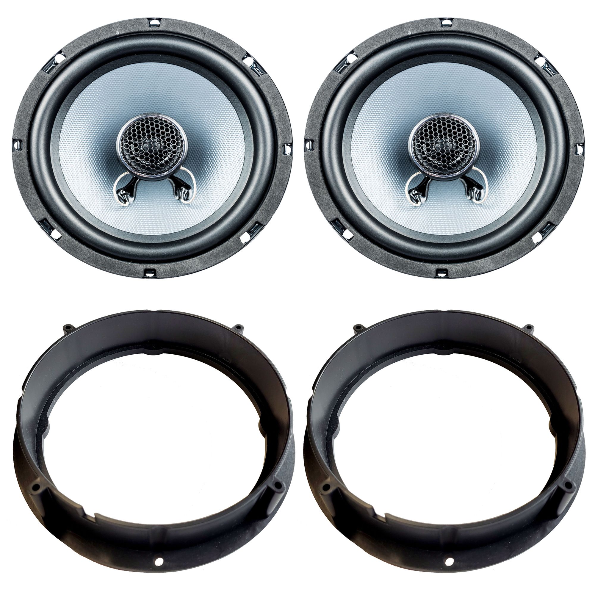 Das Set besteht aus zwei 2-Wege Lautsprechern, zwei Lautsprecher-Adapterringen und einem Zubehör Set für eine optimale Verbindung an den Original Kabeln.