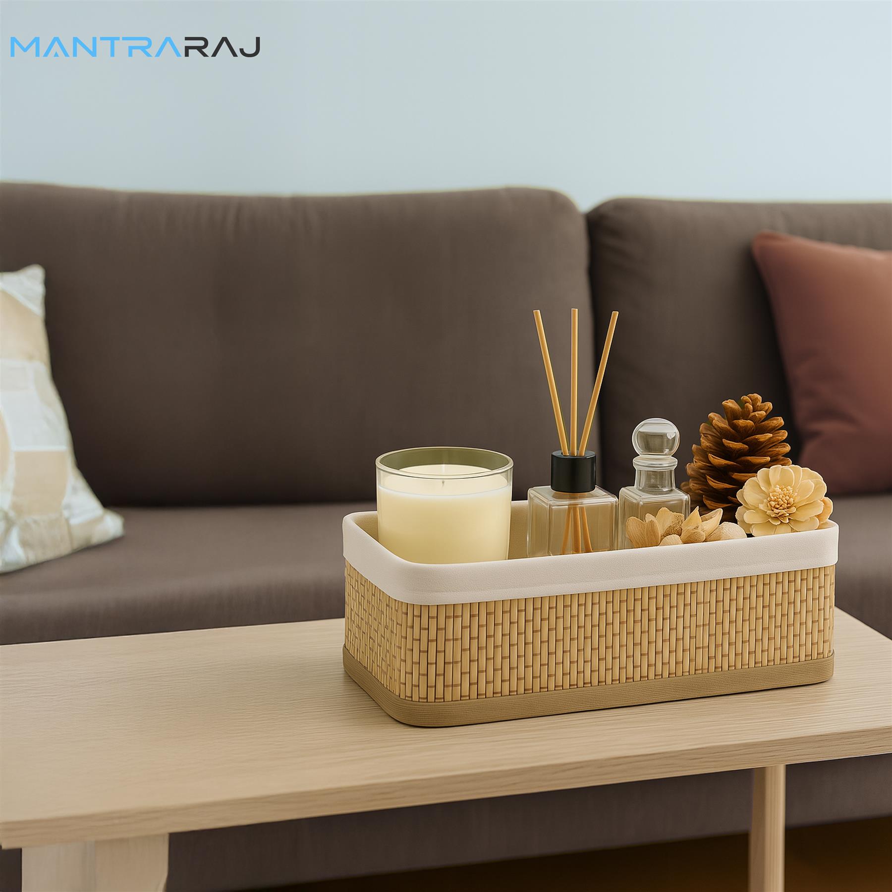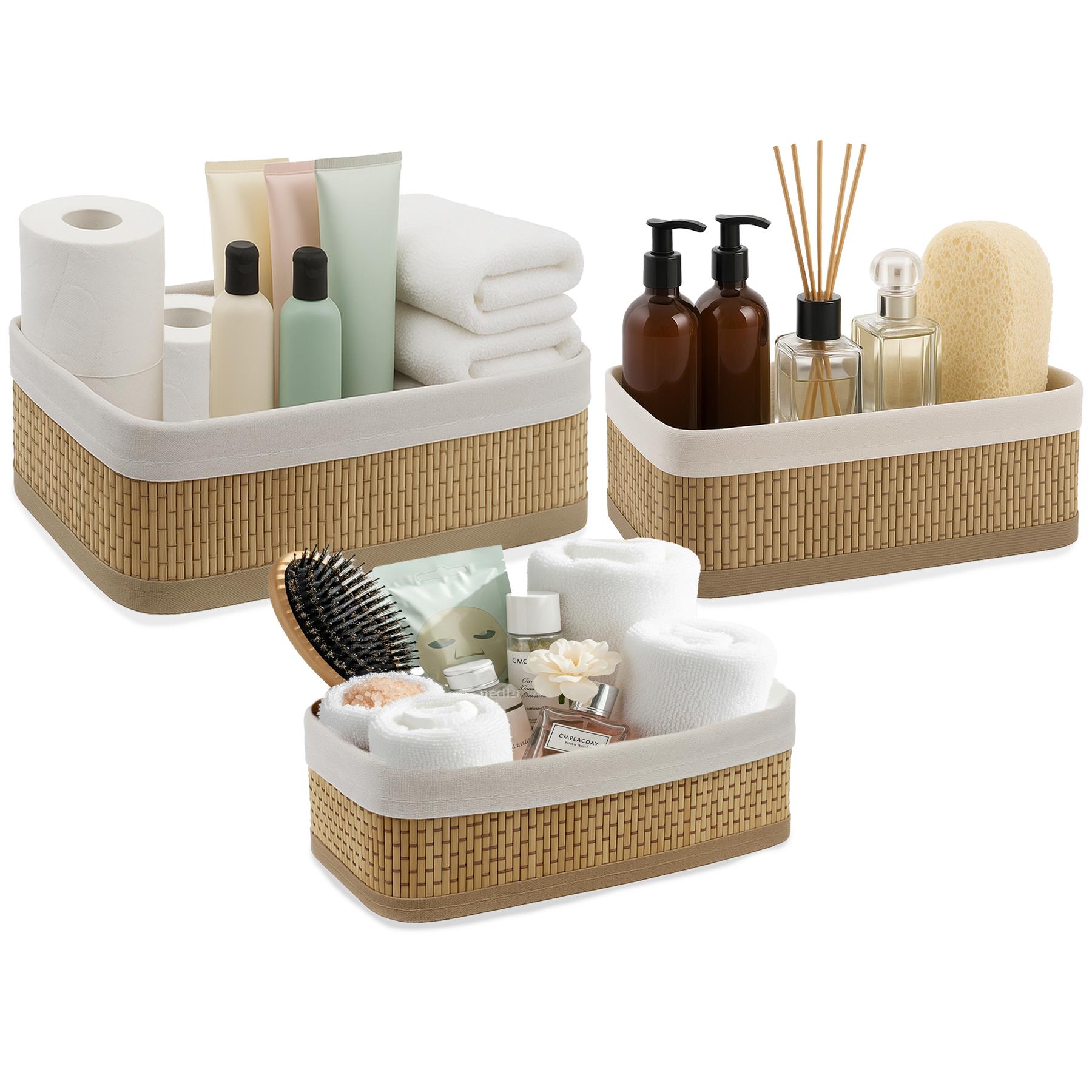 - NATURAL BAMBOO : The decorative shelf basket set provides storage space for all your day-to-day supplies - 3 bamboo bins in different sizes fit in every room - 3 rectangular baskets.Crafted from durable bamboo, these baskets add a touch of elegance and sustainability to your home decor.