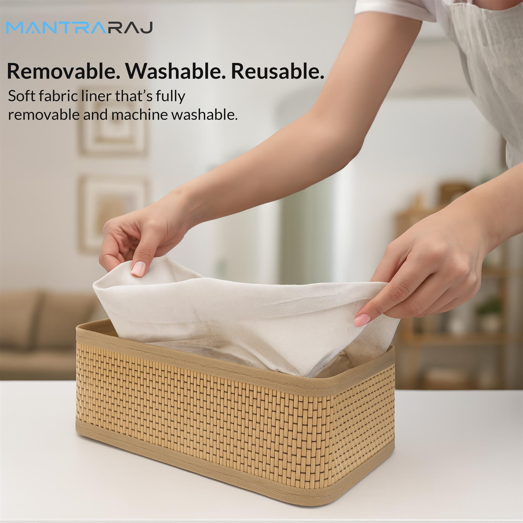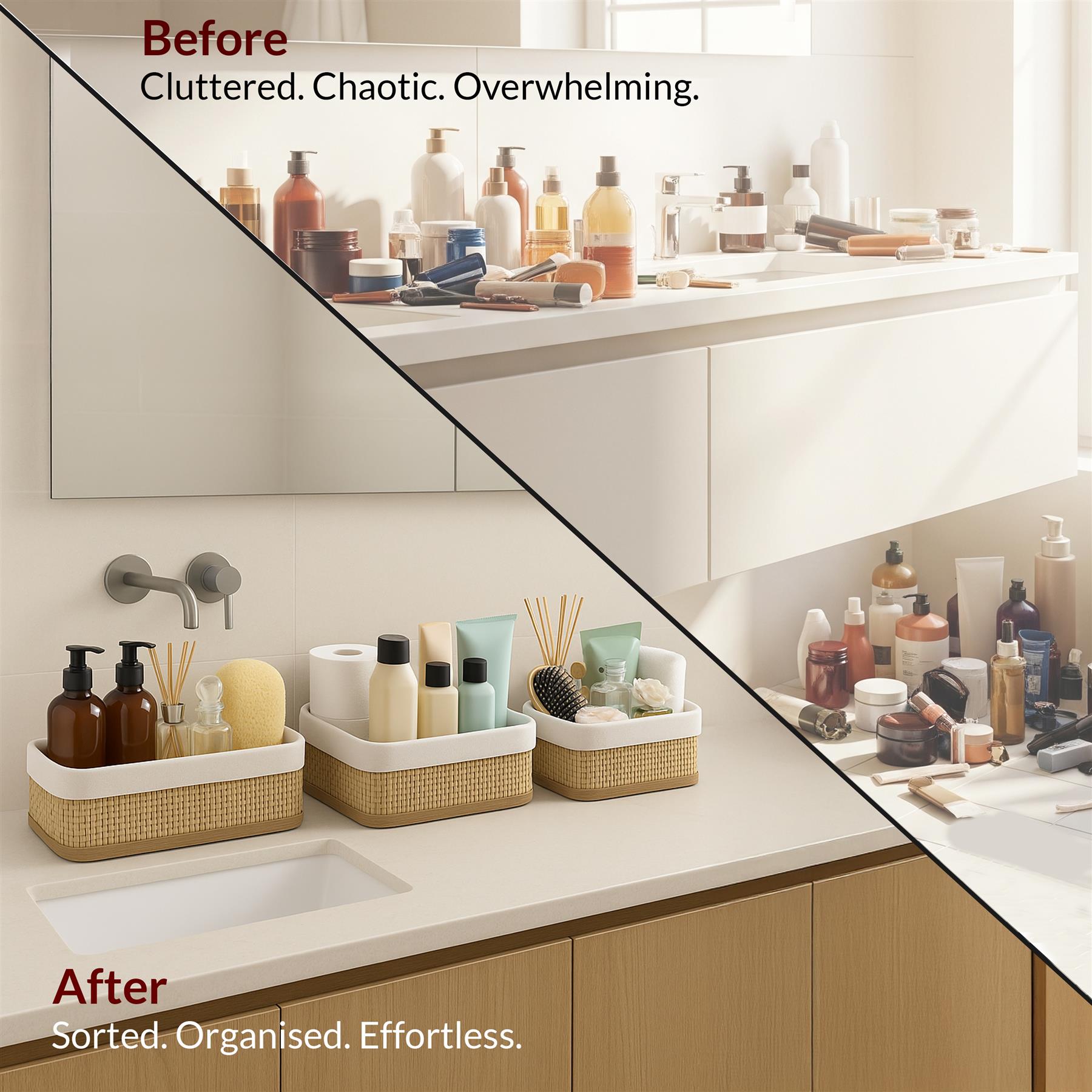 - MULTI-PURPOSE USE : Ideal for organizing makeup, bathroom essentials, closet drawers, and cupboards. The 3 boxes in various sizes can be stacked - Natural. As shelf basket in your kid’s room - Decorative living room bin or bedroom organiser.