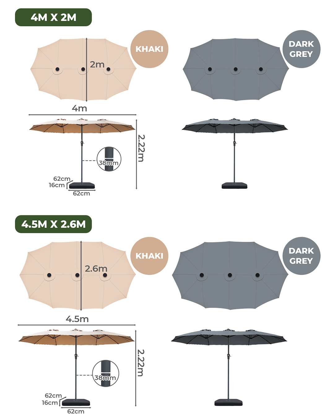 Umbrella: 400cm x 200cm x 222cm / 450cm x 260cm x 222cm