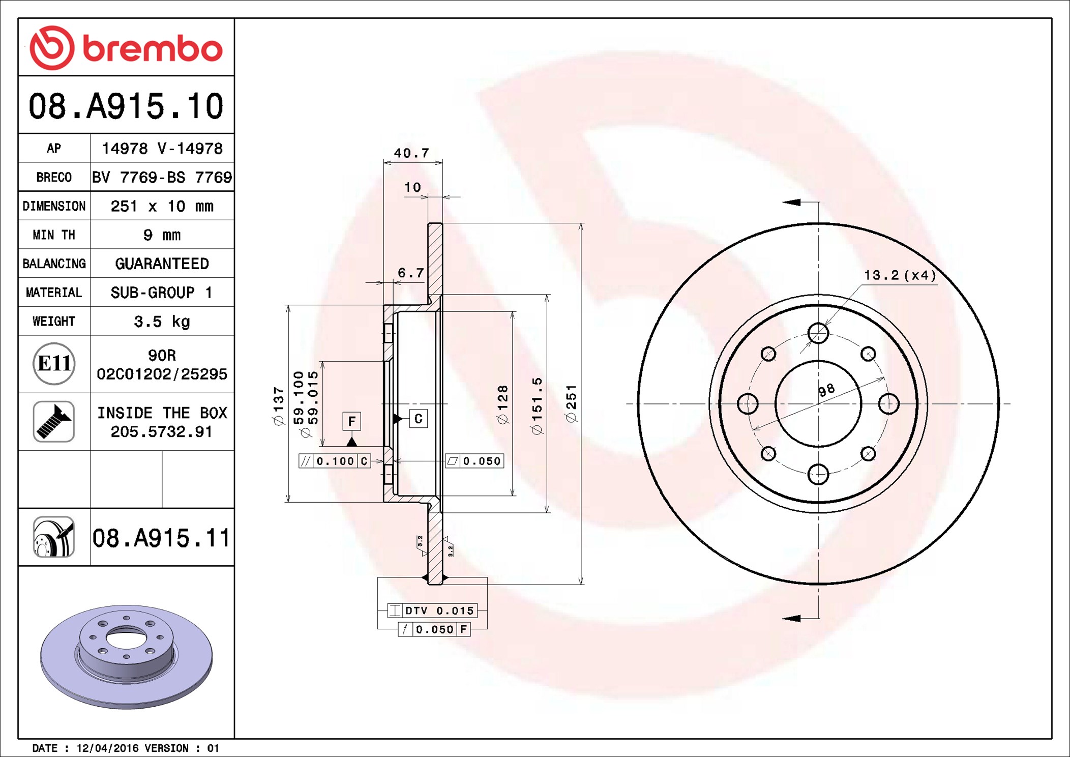 Description ![]() 2x Brake Discs Pair Solid Rear 251mm 08.A915.11 Brembo