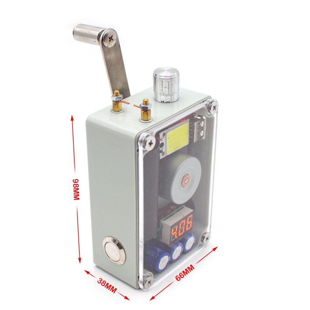 Built-in high-quality super capacitor, capacity 20F*3, 5V voltage stabilizing circuit, USB output power 5V1A, power generation of 0.56A for two turns per second by hand, 0.8A for three turns per second by hand, mobile phone charging should maintain more than two turns per second, mobile phone charging is suitable for emergency use