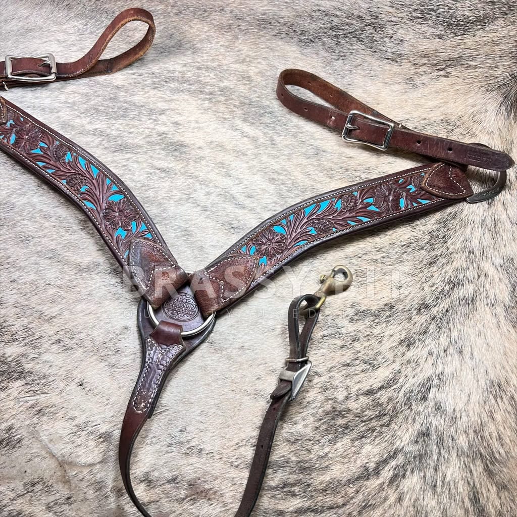 Here is a nice, very pretty, and heavy duty leather breast collar from Martin Saddlery. Made from double ply, dark oiled leather that has pretty floral tooling with turquoise painted accents. So sharp! Additionally, it has roughed out leather accents, giving it a really nice look. This will match many different brands of saddles and tack! Wider in profile with a nice contour. Horse size and offers plenty of adjustment. In very good used condition with very soft leather, showing minor signs of use and wear.