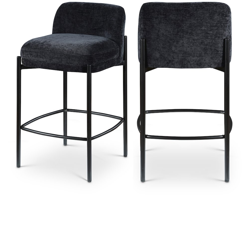 Make your kitchen counter or home bar your family's favorite spot to be with these black Burton chenille fabric bar/counter stools. Each stool boasts soft black chenille fabric and a sturdy matte black metal frame, ensuring both comfort and durability. A footrail across the bottom adds to the comfort factor of these handsome stools. Sold in sets of two per carton, these counter stools offer stylish and functional seating while infusing your space with a chic and modern touch.
