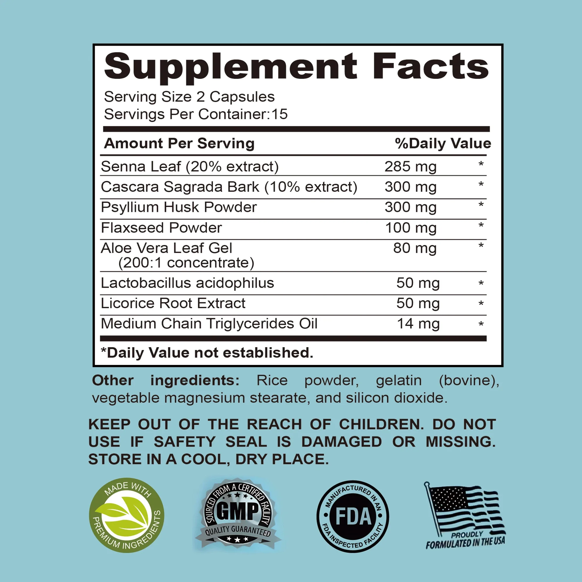 Ingredients: Senna Leaf, Cascara Sagrada Bark, Psyllium Husk, Flaxseed