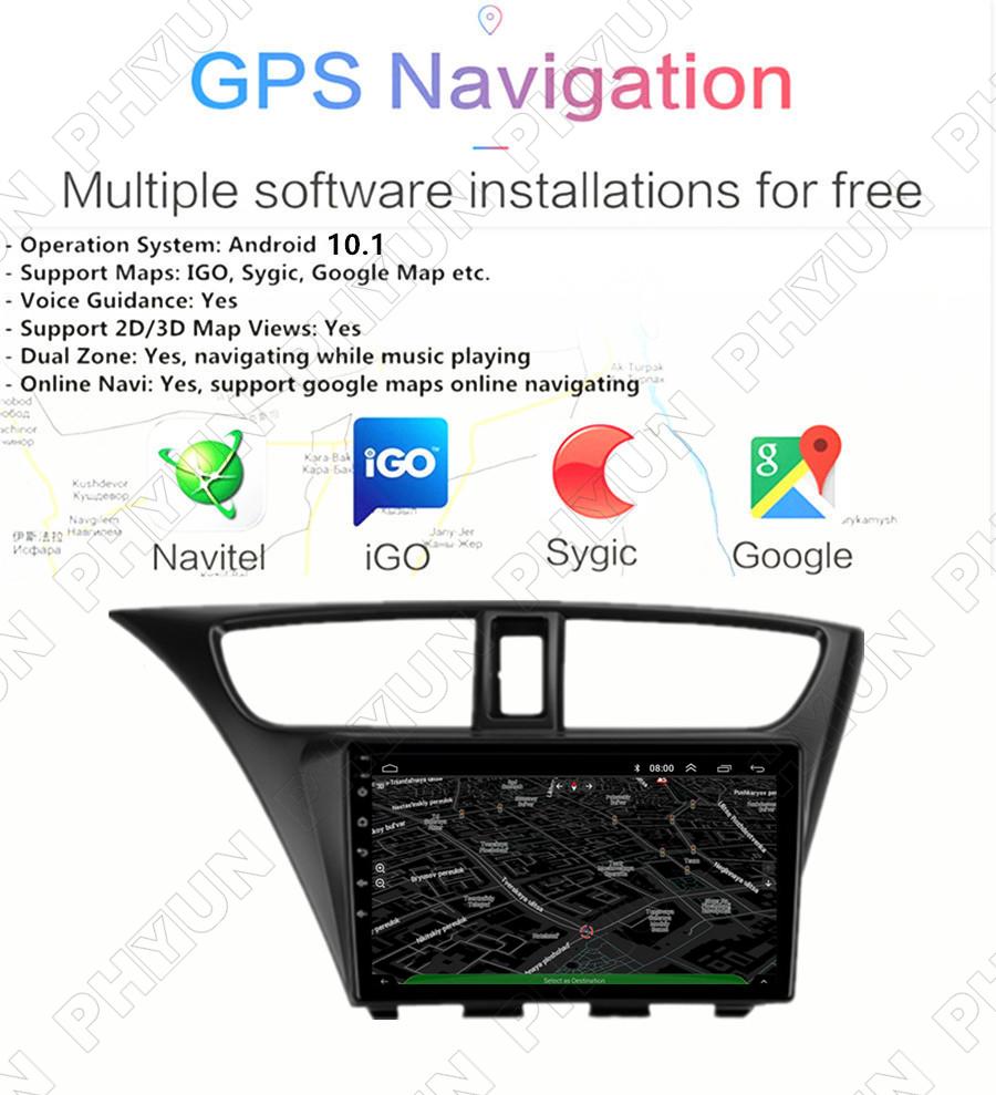 GPS | - Operation System: Android 10.1 - Support Maps: IGO, Sygic, Google Map etc. - Voice Guidance: Yes - Support 2D/3D Map Views: Yes - Dual Zone: Yes, navigating while music playing - Online Navi: Yes, support google maps online navigating |