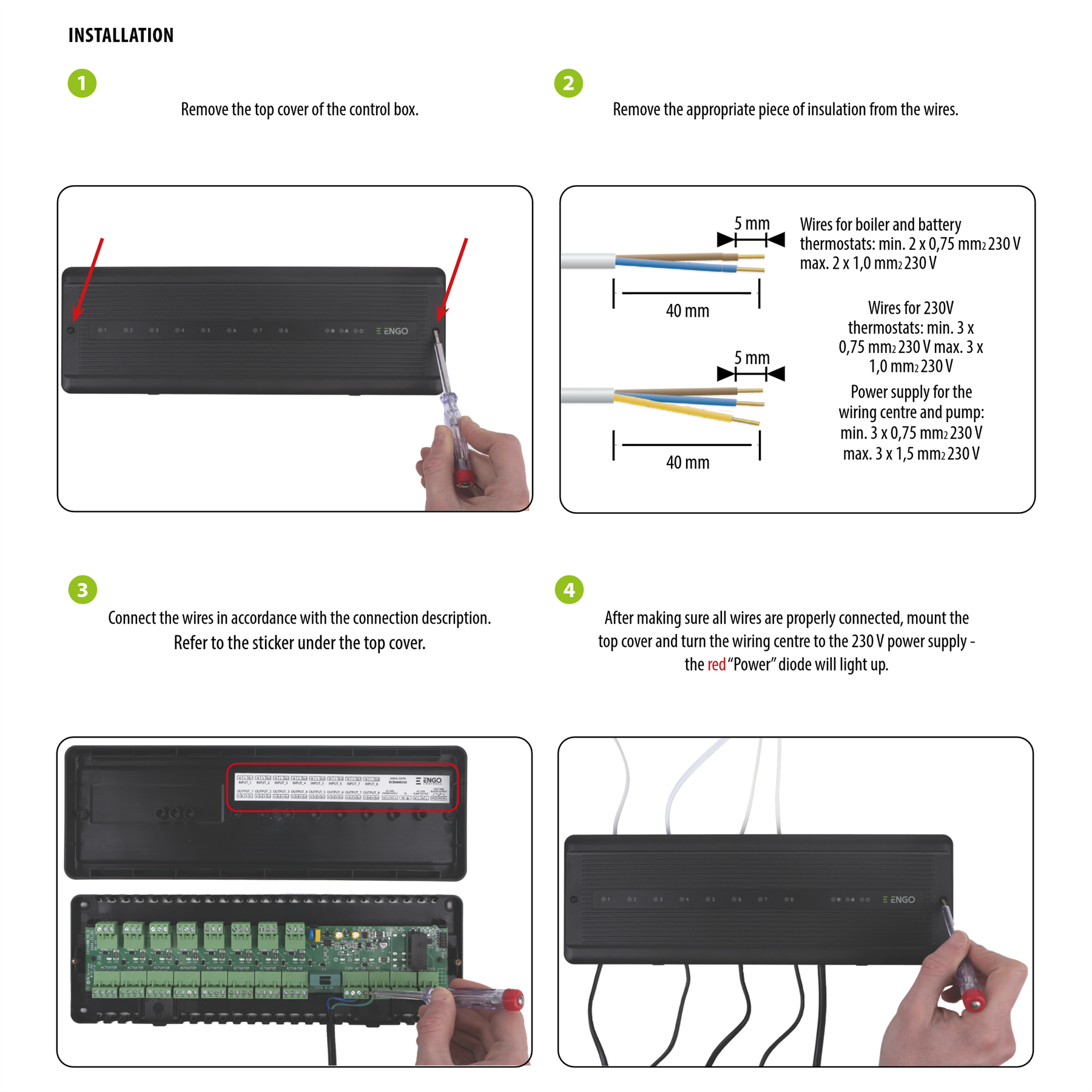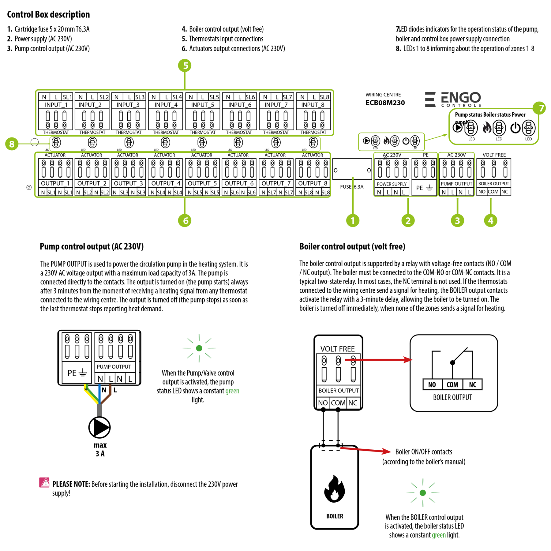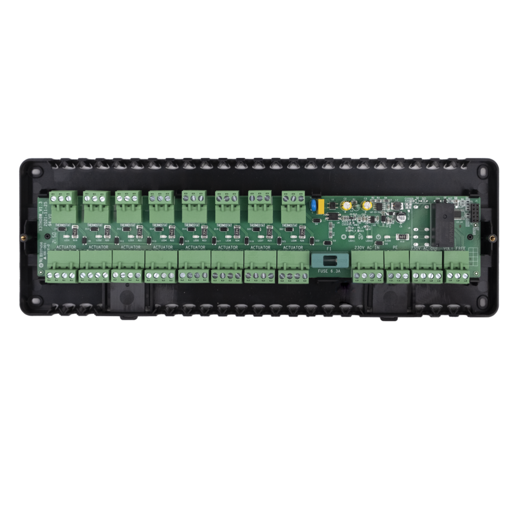 The ENGO ECB8-230 Wired Control Box is the central element of an underfloor heating control system, offering reliable management across up to eight zones. Designed for precision and ease of use, the ECB8-230 provides clear LED indicators for each zone, ensuring accurate monitoring and control of room temperatures in residential or light commercial environments. This wiring centre integrates seamlessly with thermostats, actuators, pumps, and boilers, supporting a wide range of underfloor heating configurations. Equipped with 230V AC actuator outputs, a volt-free boiler relay, and a 230V pump output with delayed start, the ECB8-230 ensures dependable and efficient operation while helping to extend system life. Supporting up to six normally-closed actuators per zone, it offers excellent flexibility for new builds, extensions, or retrofit heating projects. Engineered for professional installers, the ECB8-230 features pluggable terminal blocks for quick, secure wiring connections. Its safety-first design includes a replaceable 6.3A ceramic fuse and full compliance with EMC, Low Voltage, and RoHS directives. The compact 327 x 110 x 37 mm housing saves valuable installation space while maintaining robust durability. Whether installed in a single-family home or a larger multi-zone system, the ENGO ECB8-230 delivers efficient heating control, simplified installation, and reliable long-term performance.