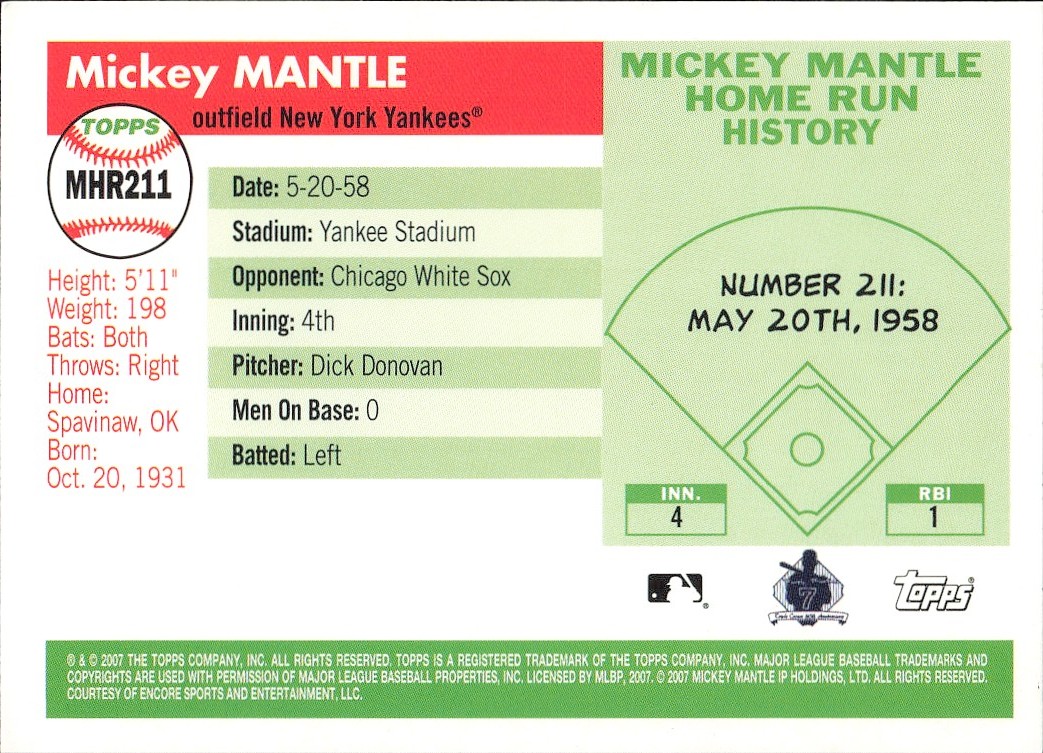 | Mickey Mantle 2007 Topps Home Run History #MHR211 New York Yankees |