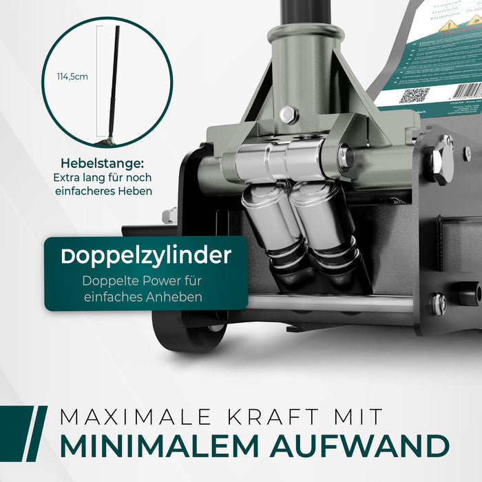 Der professionelle Doppelzylinder-Antrieb hebt dein Fahrzeug deutlich schneller und mit weniger Hüben an. Erlebe die Effizienz und Zeitersparnis eines echten Profi-Werkzeugs bei jedem Reifenwechsel.