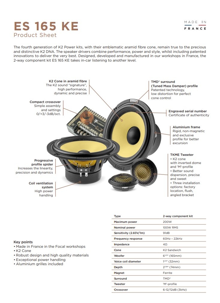 The fourth generation of K2 Power Kits with their characteristic aramid fiber membrane remains true to the valuable and distinctive K2 DNA. The speaker drivers combine performance, power and style while incorporating patented innovations to deliver the best. Designed, developed and manufactured in our workshops in France, the ES 165 KE 2-way component set takes in-car listening to a new level.