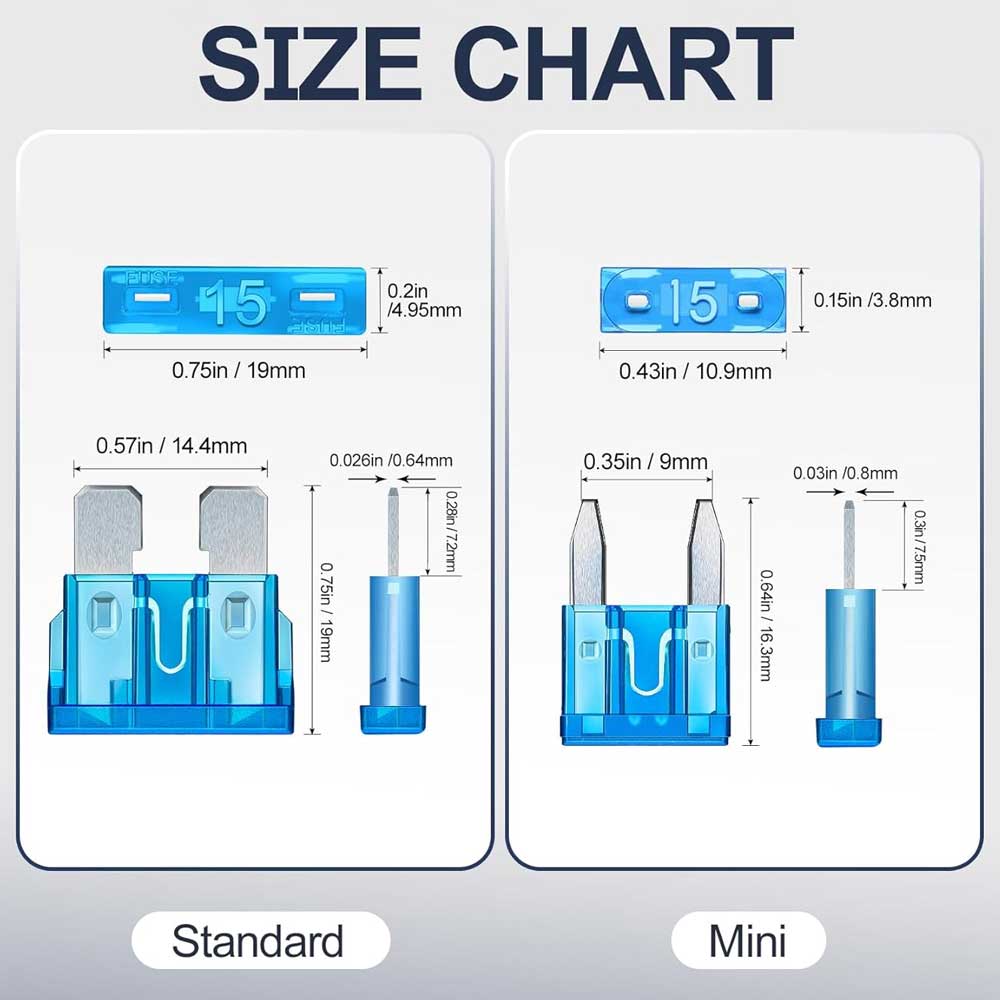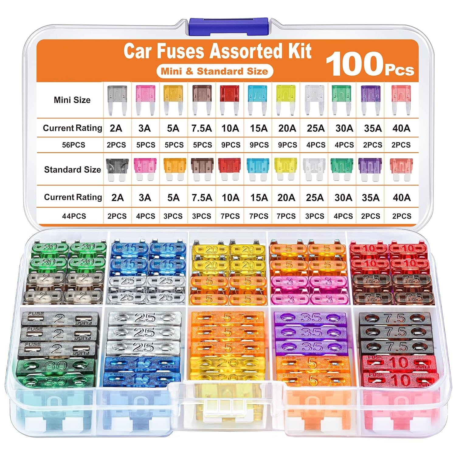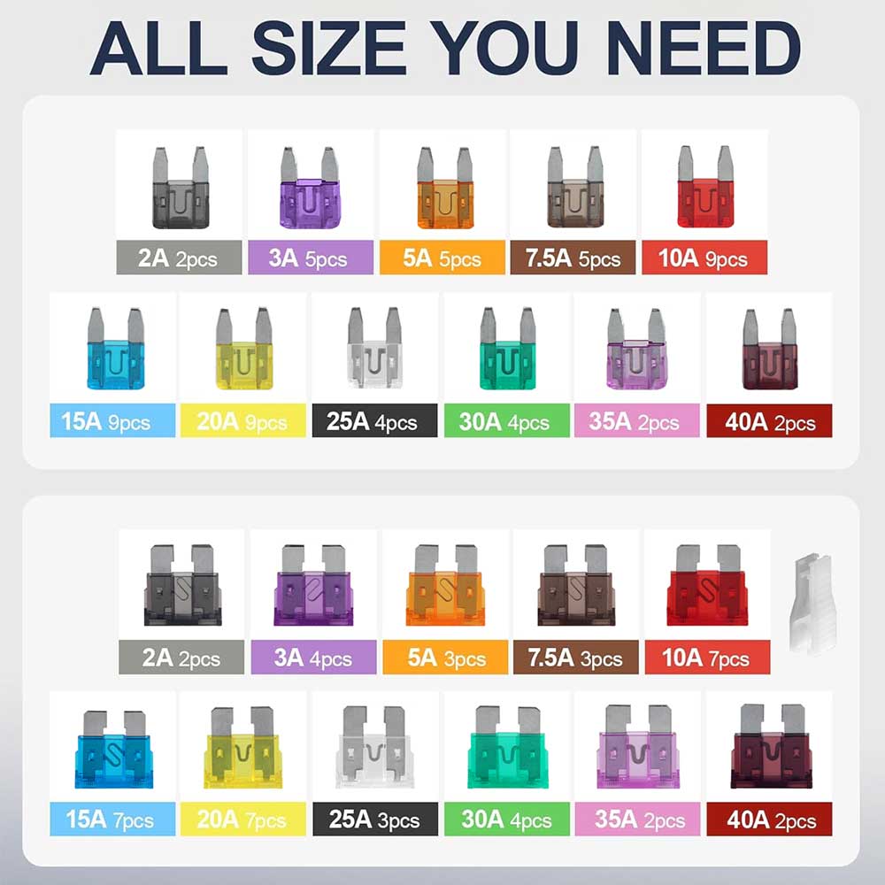 【Kostengünstiges Sicherungskit】 -- Das Kit enthält 56 Stück in Mini und 44 Stück in Standardgröße. Zwei Arten von Sicherungen haben 11 Stromspezifikationen (2 A / 3 A / 5 A / 7,5 A / 10 A / 15 A / 20 A / 25 A / 30 A / 35 A / 40 A) und sind mit einem Sicherungsabzieher ausgestattet.