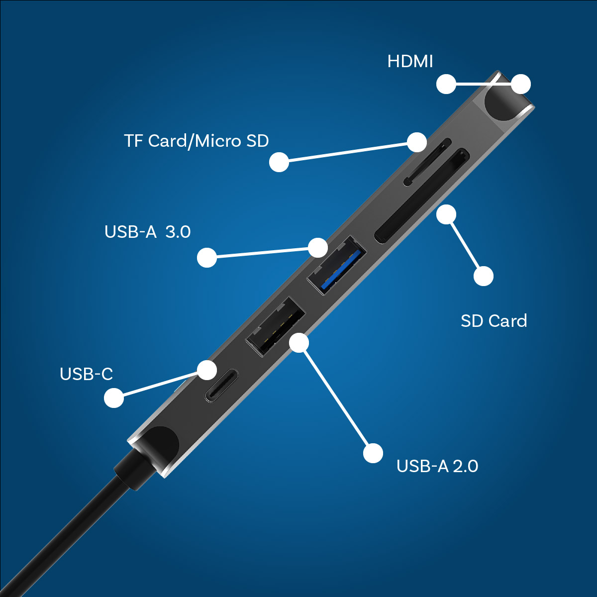 Der USB-C-Hub enthält viele verschiedene Arten von Anschlüssen, die Ihr einzelnes USB-C-Gerät in die Lage versetzen, verschiedene Geräte anzuschließen und Daten auszutauschen. Die verschiedenen Anschlüsse sind: