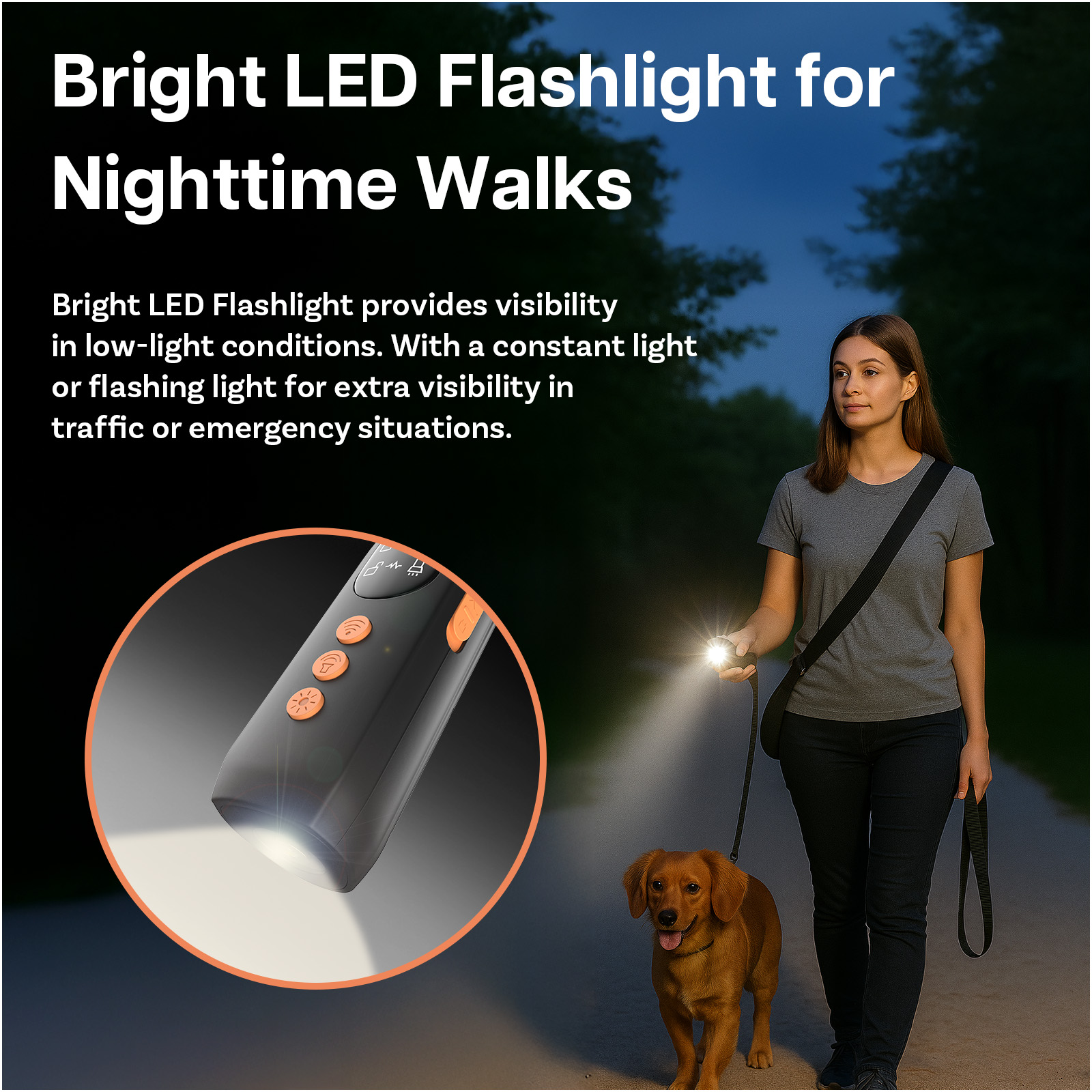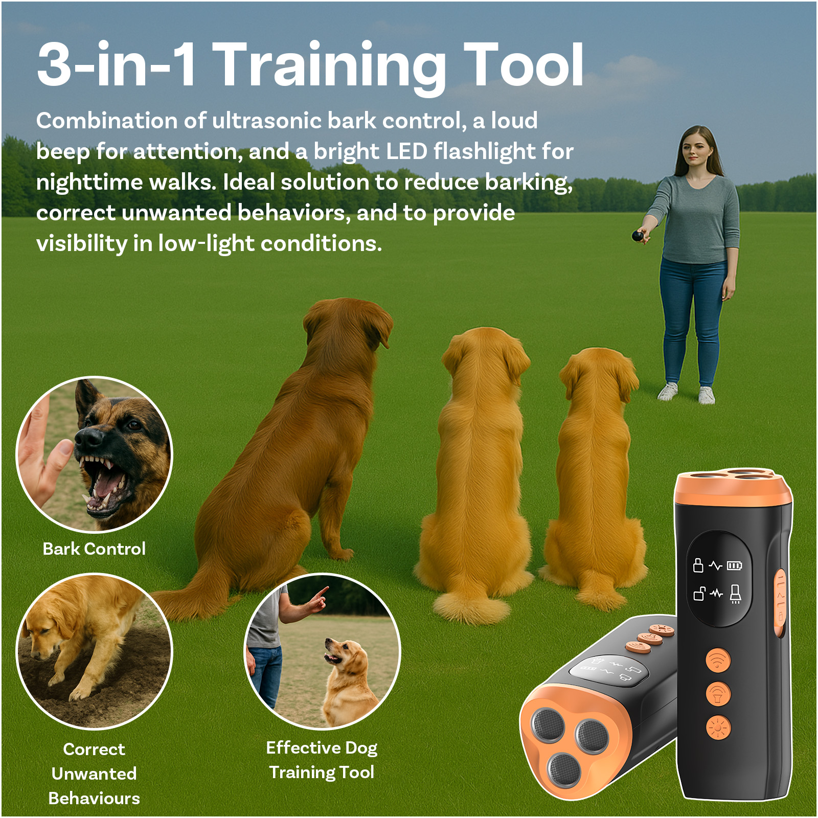 Dieses vielseitige Gerät kombiniert Ultraschall-Bellkontrolle, ein lautes Ablenkungssignal sowie eine helle LED-Taschenlampe für nächtliche Spaziergänge. Mit separaten Tasten für jede Funktion ist es ideal, um unerwünschtes Verhalten zu korrigieren, den Hund gezielt abzulenken und bei schlechten Lichtverhältnissen für Sicherheit zu sorgen.
