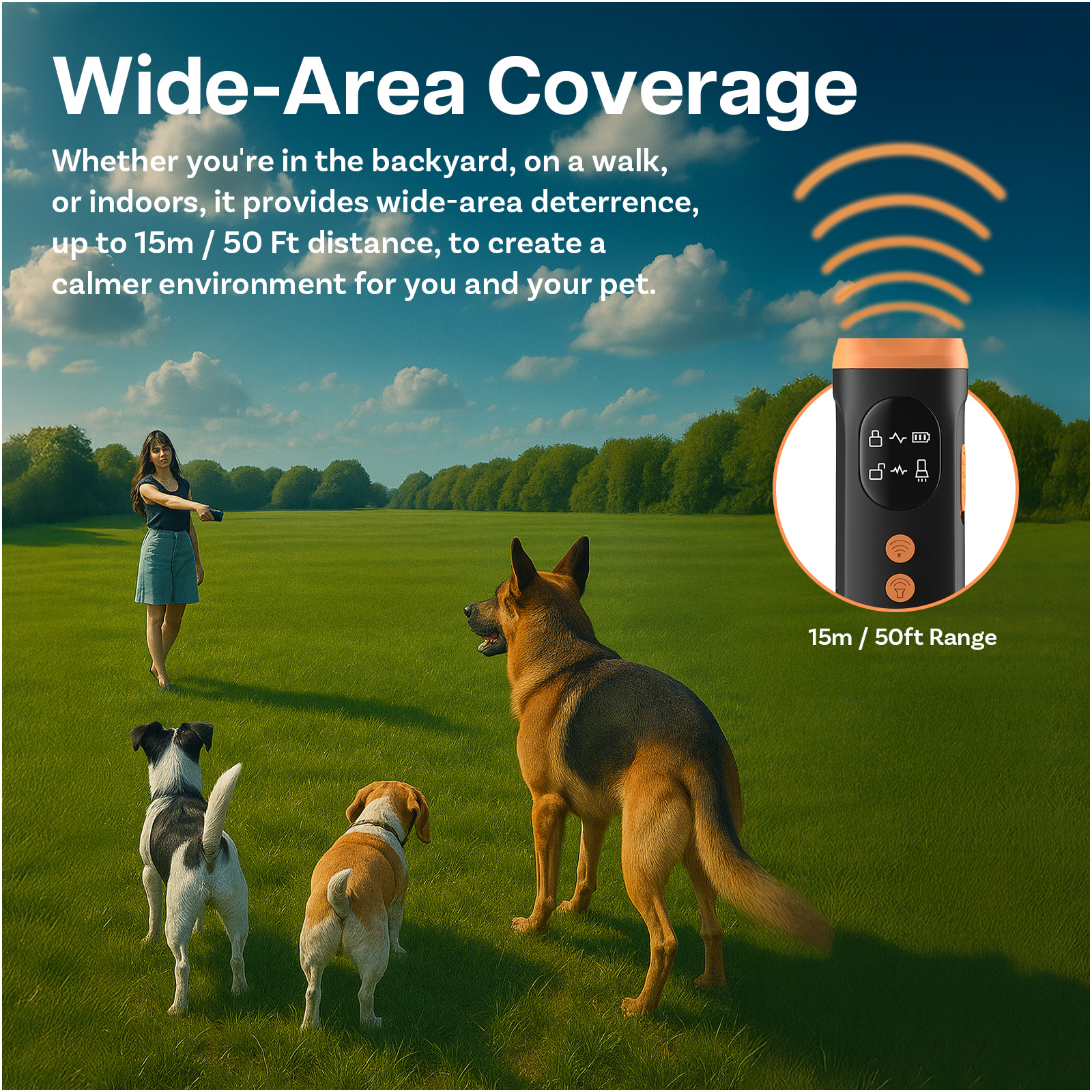 Die zwei integrierten Sender wirken nicht nur auf den eigenen Hund, sondern auch auf bellende Hunde in der Umgebung. Ob im Garten, beim Spaziergang oder im Haus: Das Gerät deckt einen weiten Bereich ab und sorgt für eine ruhige Umgebung für Sie und Ihr Haustier.