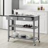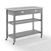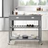 With its sleek modern design and stainless steel countertop, the Chloe Kitchen Island/Cart is ideal for adding extra counter space to your kitchen. Featuring two large full-extension drawers with recessed metal drawer pulls, this kitchen island with storage keeps accessible for your meal prep routine. Two open shelves keep larger items close at hand, including one with a slatted design sized perfectly for wine bottles. Sturdy caster wheels for mobility make this kitchen cart a serving space ready to adapt to your needs.