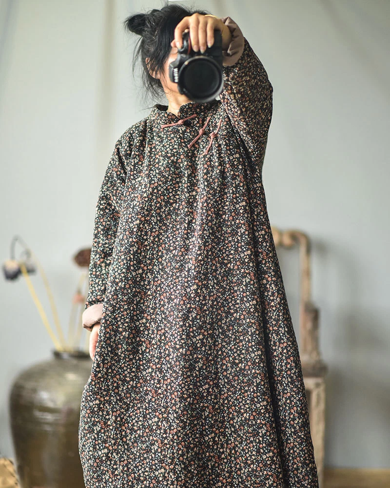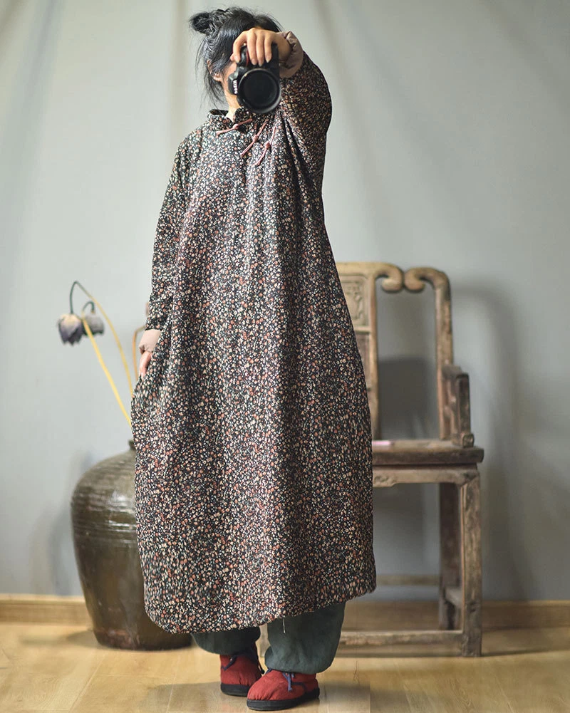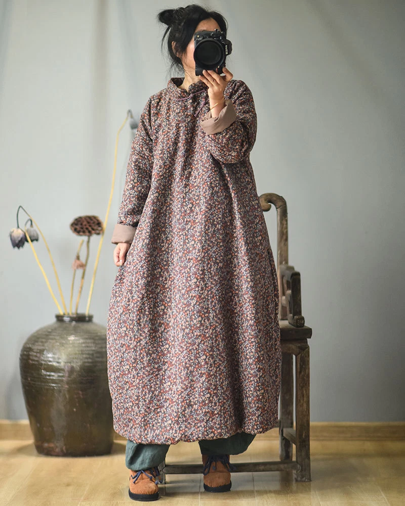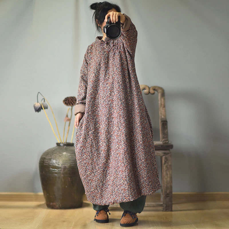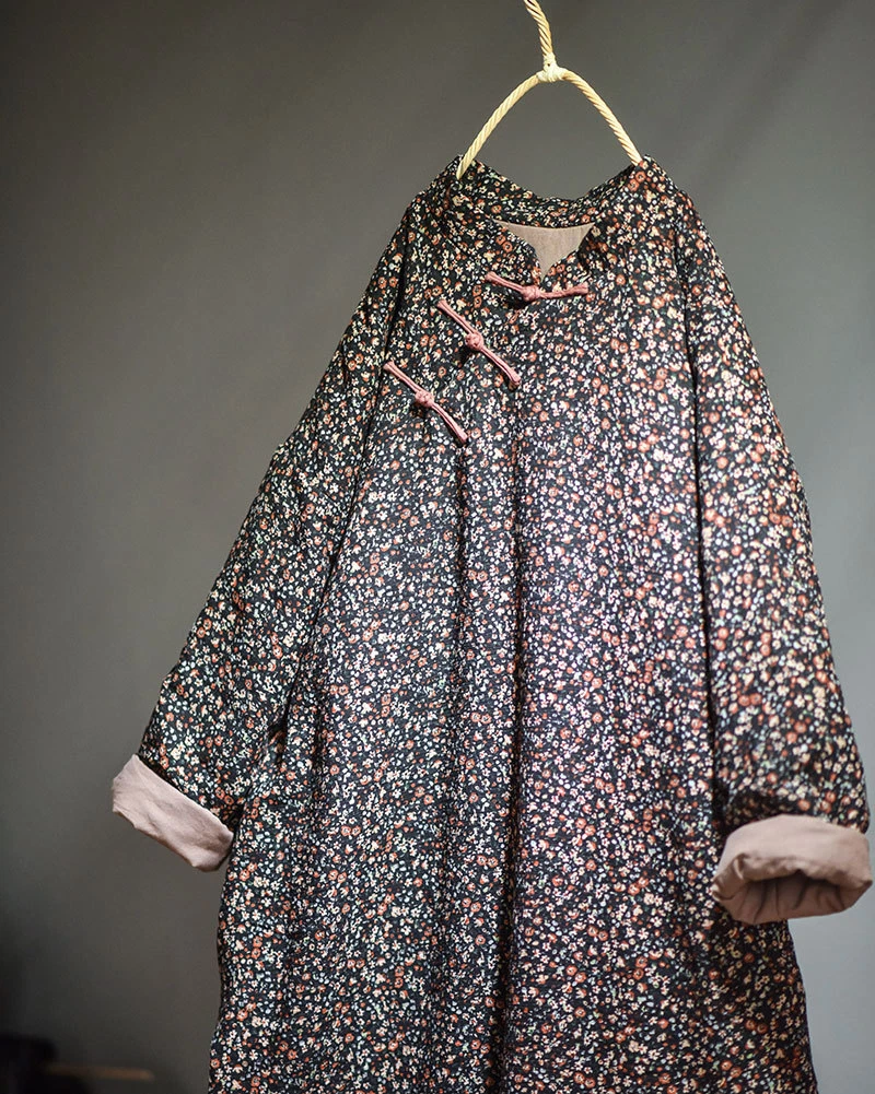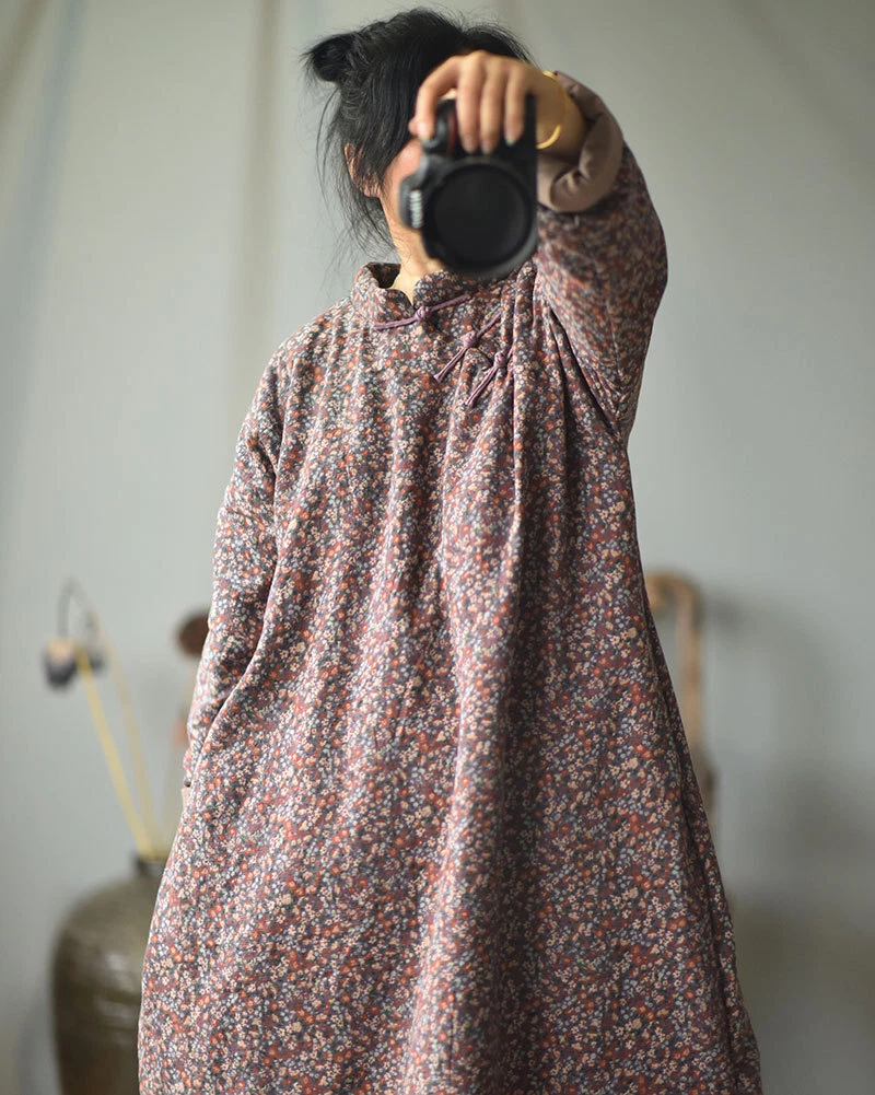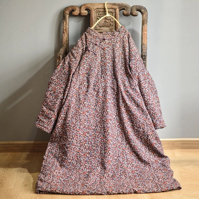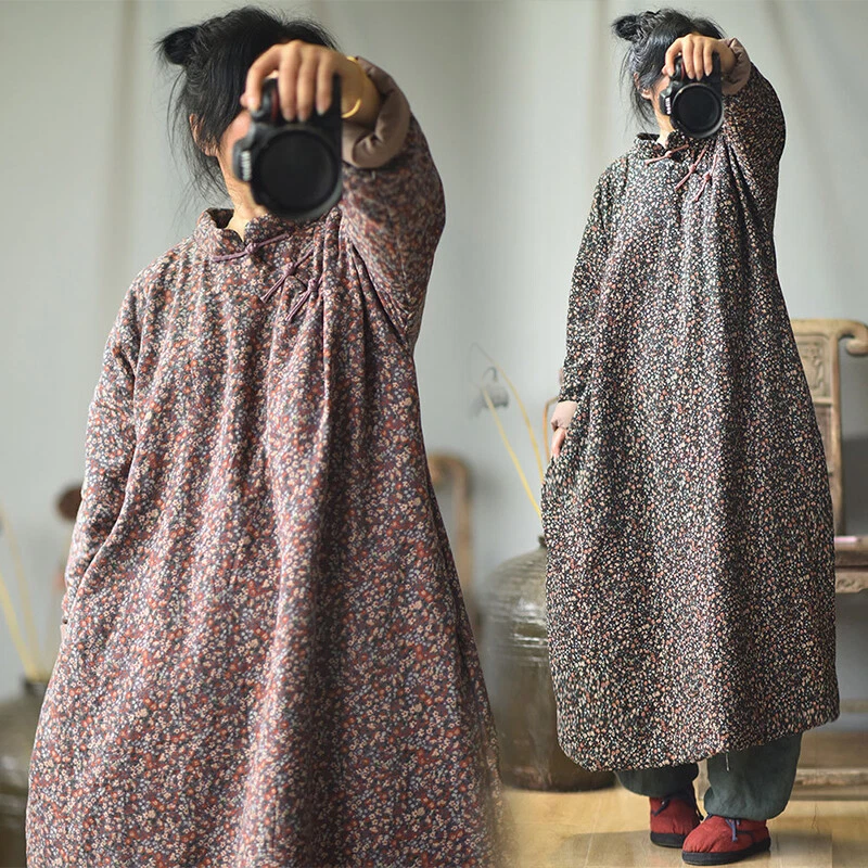 Women's Retro Long Quilted Jacket Coat Dress Floral Cotton Chinese Vintage Linen