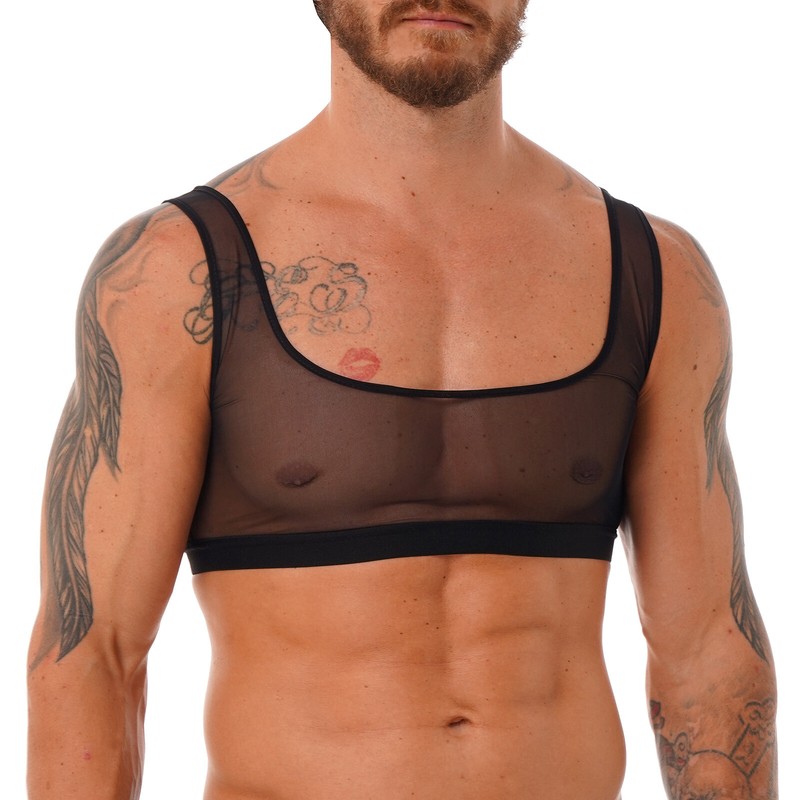 Sleeveless and u neckline, slim fit and see through design, pull on closure.