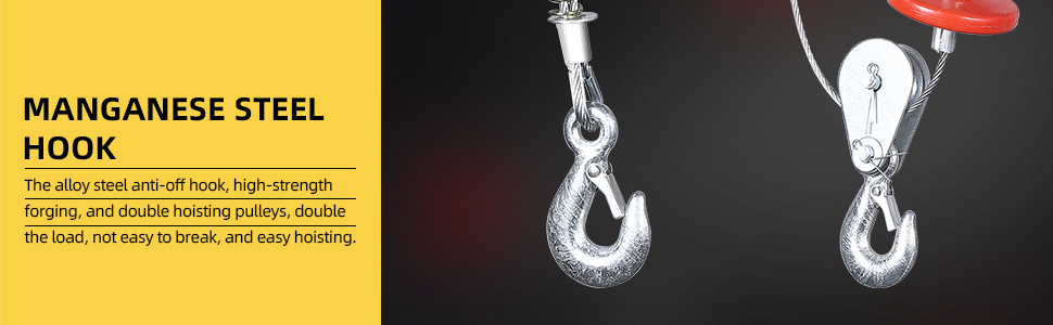 【High Load Bearing Power】 This electric hoist delivers impressive lifting strength, supporting up to 440 lbs with a single cable and 880 lbs with a double cable. Equipped with a durable high-carbon steel cable and robust manganese steel hook, it safely handles heavy duty tasks in garages, warehouses, and construction sites with ease.