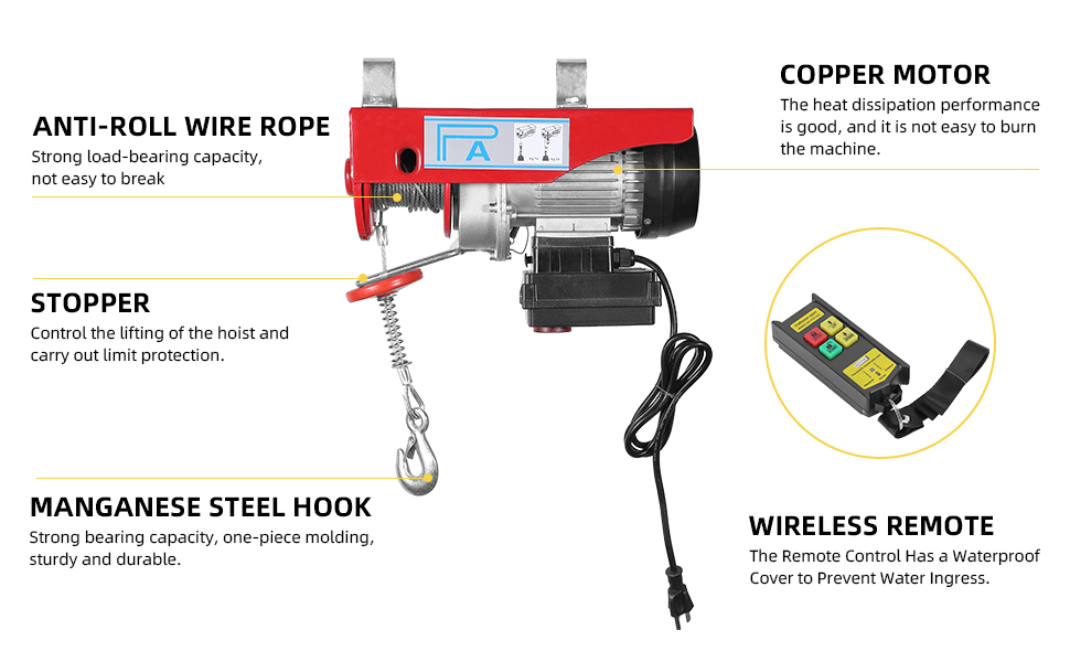 【Fast & Efficient Lifting】 With an 850W pure copper motor and high-torque output, this power hoist achieves rapid lifting speeds up to 33 feet per minute on a single cable and 16.5 feet per minute on double cable. Ideal for quickly and safely raising engines, tools, or bulky materials in demanding work environments.