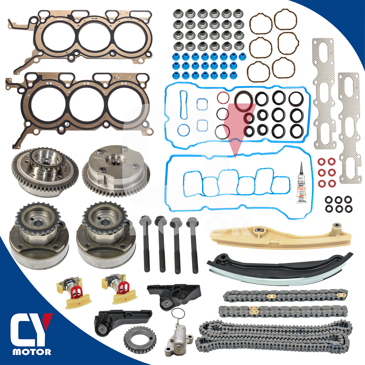 1 Cadena De Distribución / Primary Timing Chain (254 Link - Silent Type)2 Cadena De Distribución / Secondary Timing Chain (50 Link - Roller Type)1 Engrane De / Rueda De Espigas / Crankshaft Gear (29 Teeth)1 Guía / Timing Guide (Lower, Left)1 Guía / Timing Guide (Lower, Right)1 Guía / Timing Guide (Upper)1 Guía / Timing Guide (Lower1 Tensor / Primary Timing Chain Tensioner2 Tensor / Secondary Timing Chain Tensioner2 Timing Chain Tensioner Arm2 Engrane De VVT / Rueda De Espigas / Cam Gears / VVT Cam Sprocket Exhaust