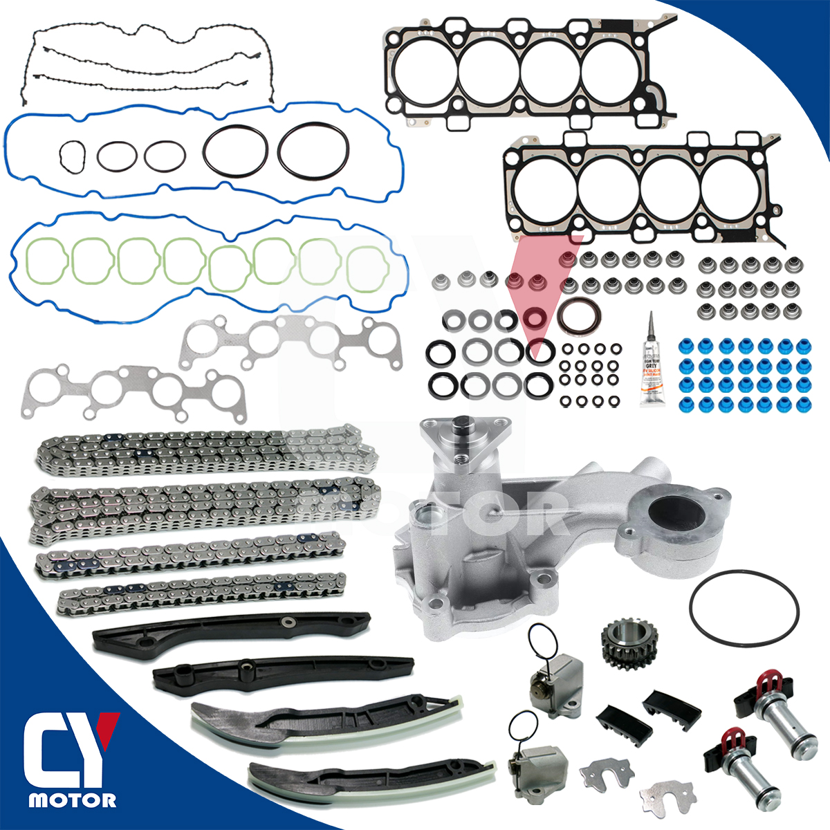 2 Cadena De Distribución / Timing Chains (Primary - Lower)2 Cadena De Distribución / Timing Chains (Secondary - Upper)2 Tensor / Timing Chain Tensioners (Lower)2 Tensor / Timing Chain Tensioners Arms4 Guía / Chain Guide Rails1 Engrane De / Rueda De Espigas / Crank Gear (Double Row)1 Water Pump With a Oil Seal1 Juego De Juntas Culata / Cylinder Head Gasket Set - Cylinder Bore Diameter 94.5 MM( Multiple Layers Steel (MLS) Head Gasket )1 High Temp Grey RTV Silicone- 1.76 OZ / 50 G