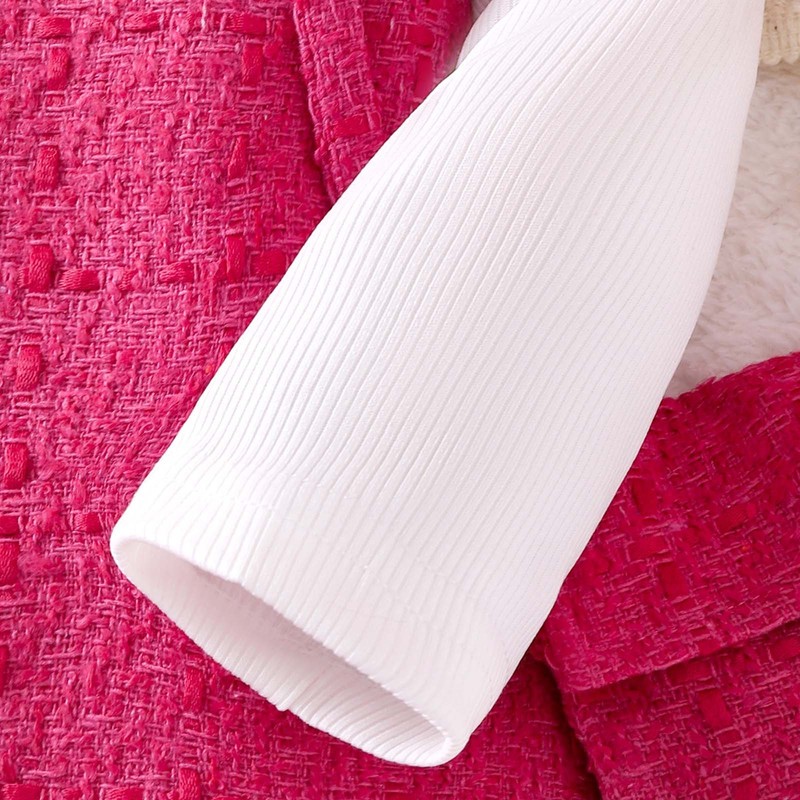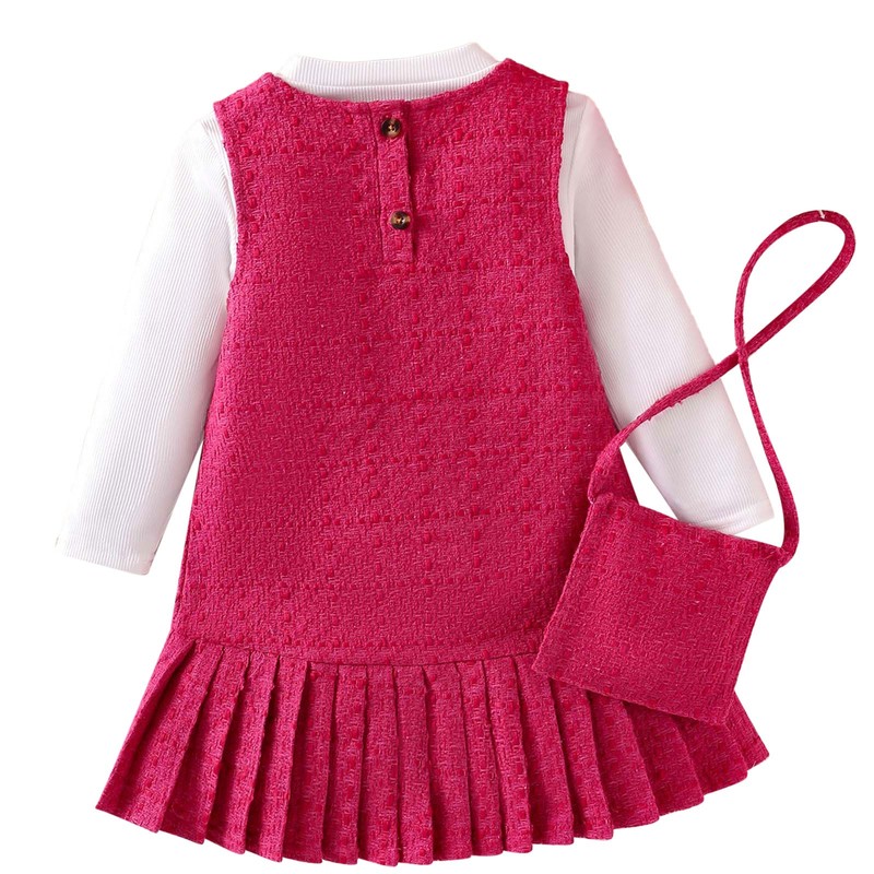 Set Include: 1Pc Shirt, 1Pc Tank Dress, 1Pc Sling BagCondition: New with tagsMaterial: 90% Polyester, 10% SpandexFeatures:Made from a blend of polyester and spandex, the outfit is stretchy and comfortable, allowing your little girl to move freely during various activities.The long-sleeve crew-neck ribbed shirt adds a touch of classic elegance, while the pleated hem tank dress brings a trendy and feminine look, making your girl stand out.The included sling bag is not only a practical accessory for carrying small essentials but also a fashionable addition that complements the overall outfit.The color of rose red is vibrant and eye-catching, which is very in line with the current fashion trend and suitable for girls of all ages.This outfit is perfect for multiple occasions such as festivals, banquets, homecoming parties, birthday celebrations, Christmas gatherings, casual outings, and photo shoots.