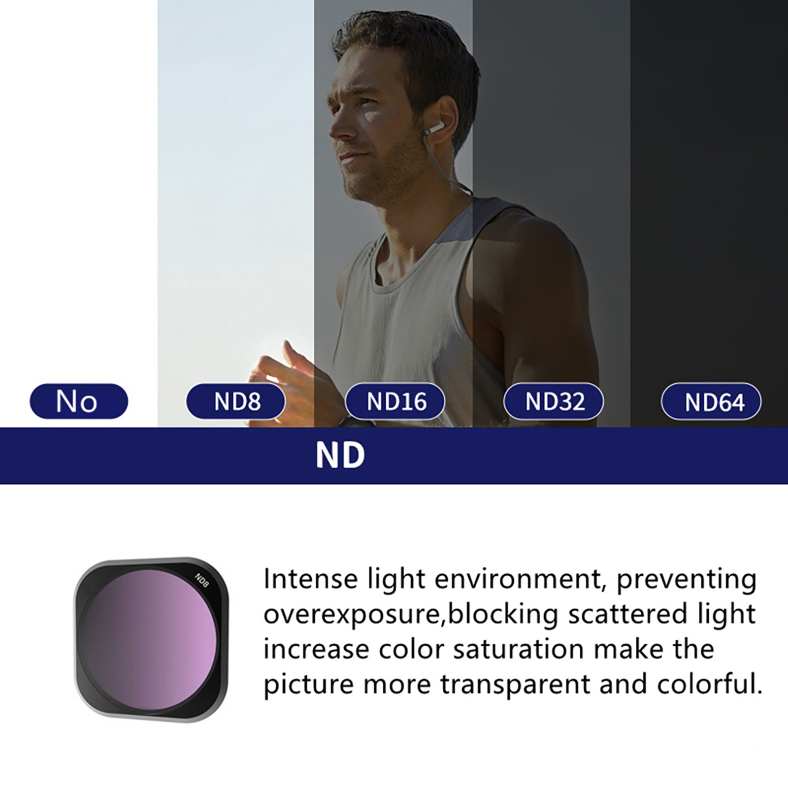 3.ND Filter: Using this filter, you can get more freedom in controlling the aperture and shutter, bringing more exposure means and creative space for photography creation, and effectively preventing overexposure, the number behind the ND, that is, on behalf of the ability of the ND mirror to block light.