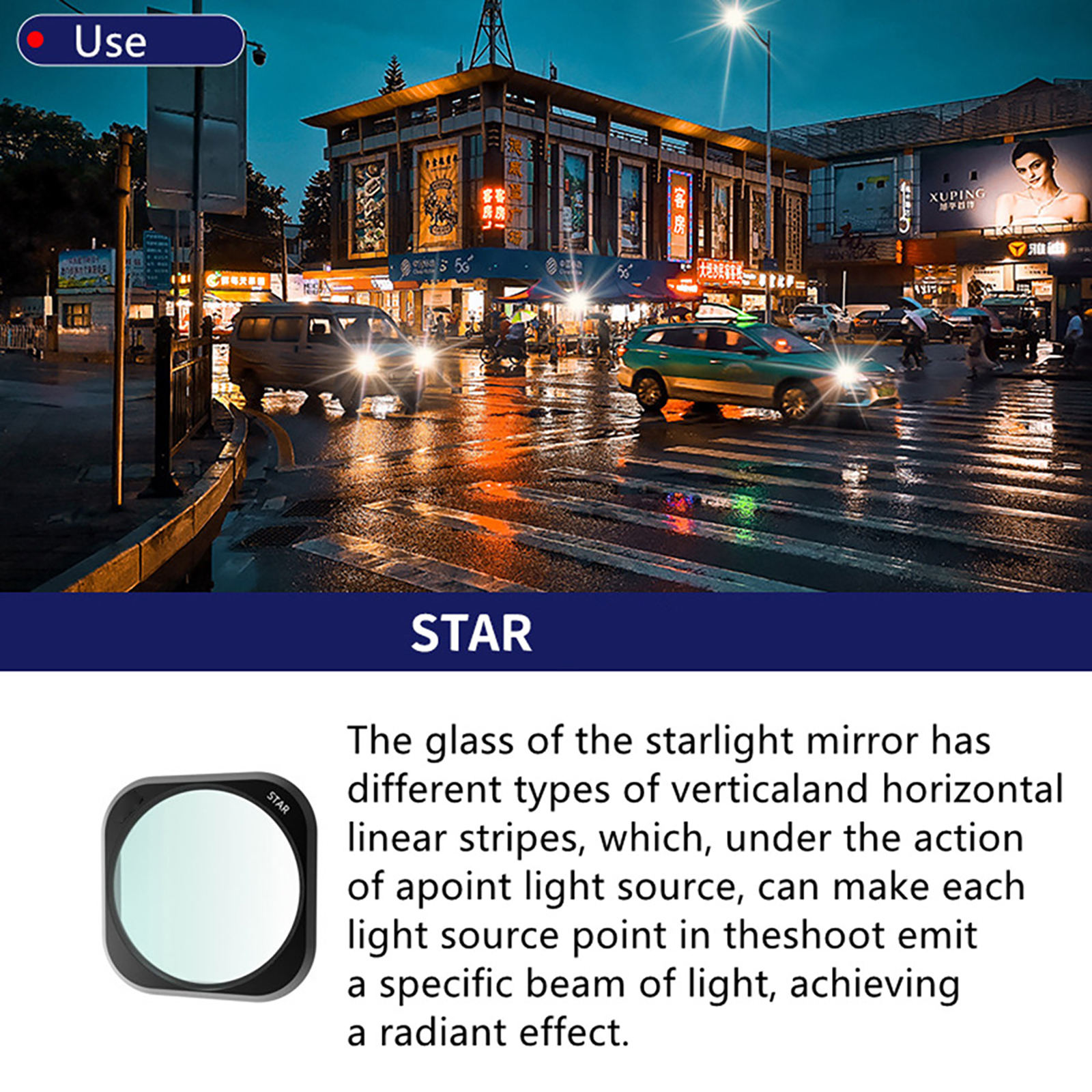 5.Starlight mirror is a type of effect that generates diffraction of light at the center of a luminous point, resulting in a radiant effect. It is a necessary effect mirror for shooting stage or night scenes, and can play an extraordinary role in the picture.
