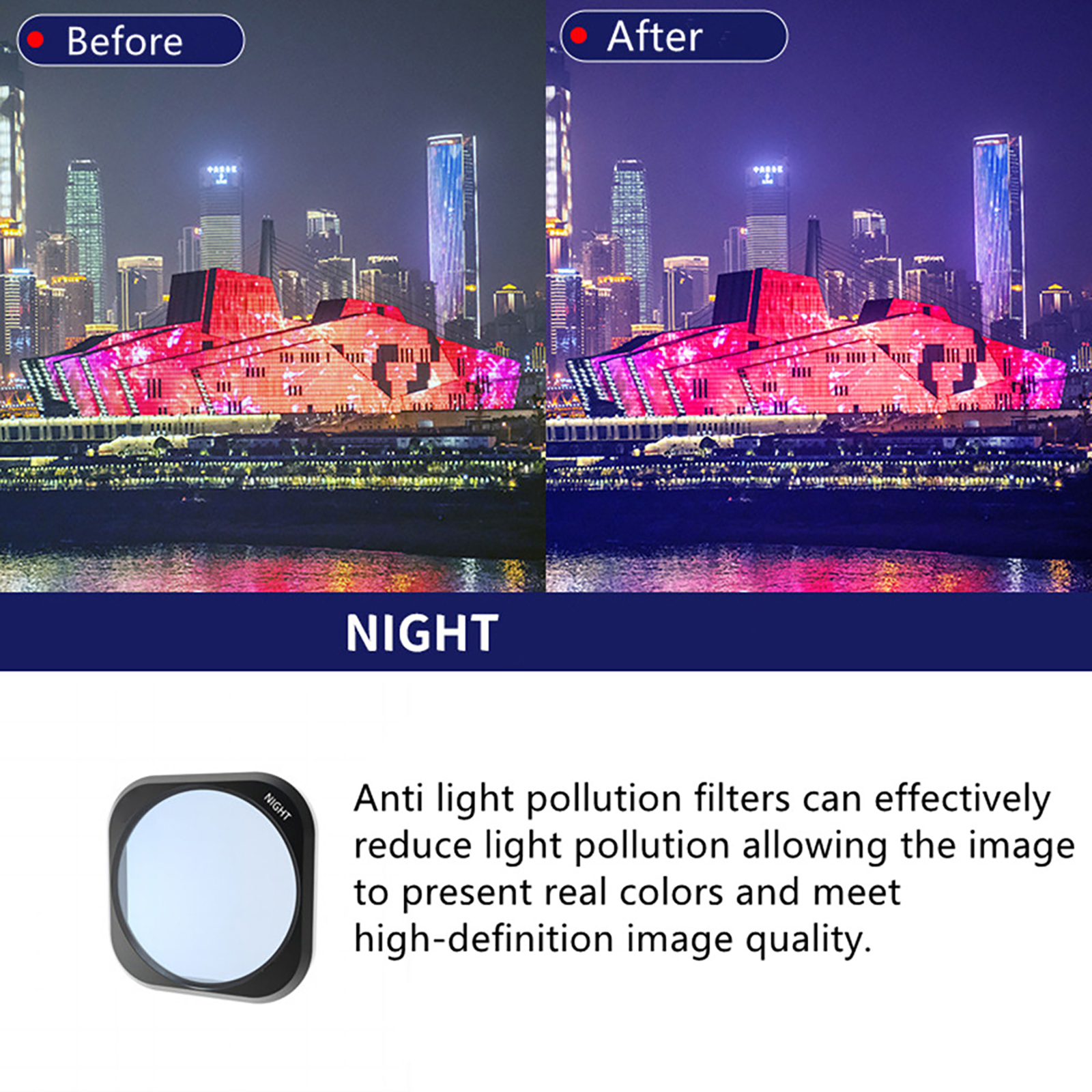 4.Night damage filter, can effectively reduce the light pollution so that the picture shows the real color Anti light damage filter strictly selected optical glass material, full of high-definition picture quality.