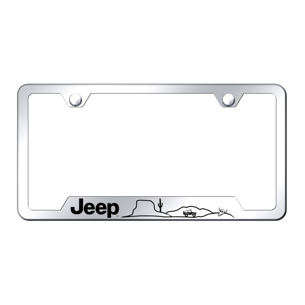 Au-TOMOTIVE GOLD Laser Etched Jeep Desert Name and Desert on a Stainless Steel Cutout Bottom License Plate Frame