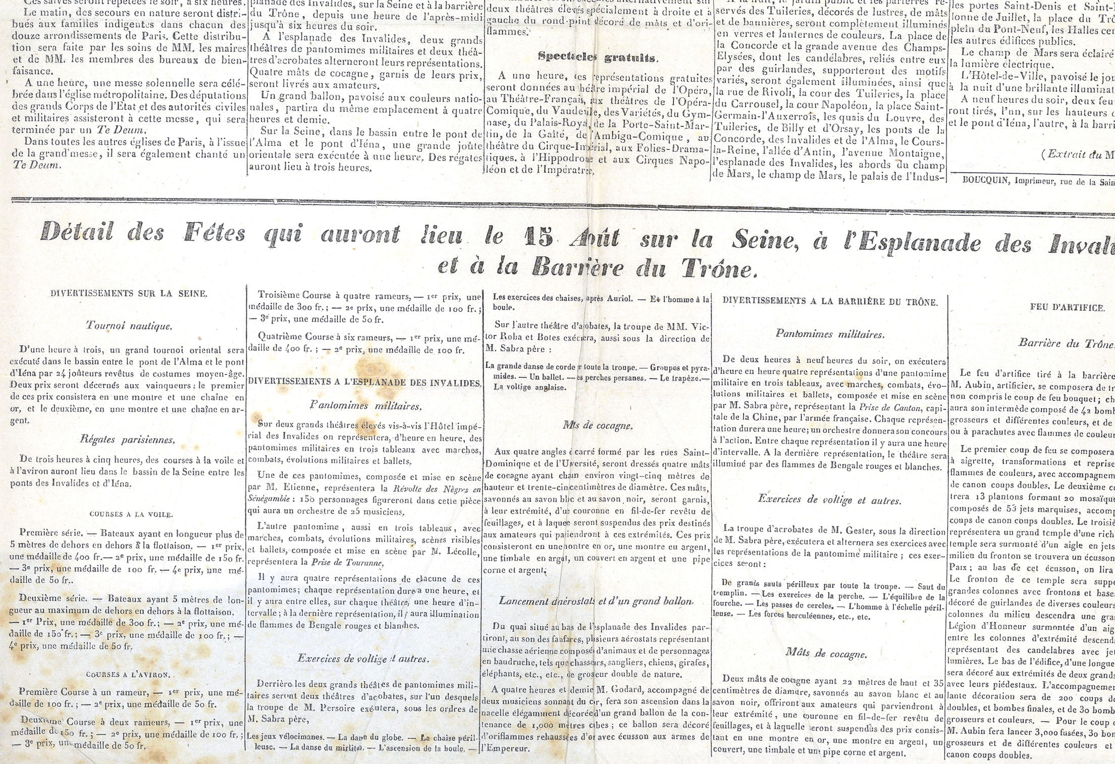 Affiche rarissime contenant le détail des Fêtes parisiennes du Dimanche 14 Août et du Lundi 15 Août 1859 (Défilé des troupes de l'Armée d'Italie, pantomimes militaires, ballons, secours aux indigens, jeux de funambules "à la barrière du Trône", décors nocturnes lumineux, etc.). La plupart de ces réjouissances avaient lieu sur la Seine, à l'Esplanade des Invalides et à la Barrière du Trône. Au centre de la partie supérieure se trouve une gravure sur bois représentant l'Aigle impérial. Traces de plis. Bon exemplaire.
