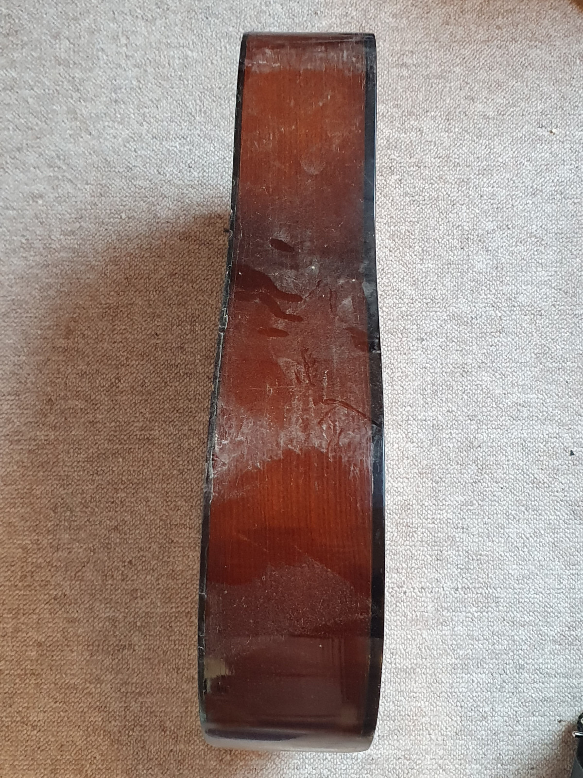 Leider ist es nur der Body, ohne Elektronik und ohne Hals etc. Der Body ist ca. 50cm lang, an der breitesten Stelle hat er ca.40cm und er ist oben ca.9 cm dick. Vermutlich wurde der Body 1981 hergestellt. Im inneren fand ich eine Zeitung (Erlanger Nachrichten) von 1981. Das Instrument muss fertiggestellt werden. Die (Papier) Dekoration um das Schalloch herum ist beschädigt. (siehe Photos) Bitte beachten Sie auch meine anderen Auktionen mit Artikeln aus dieser Lagerauflösung! International bidders are welcome, please ask.