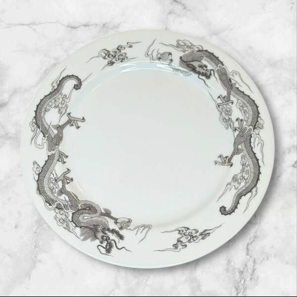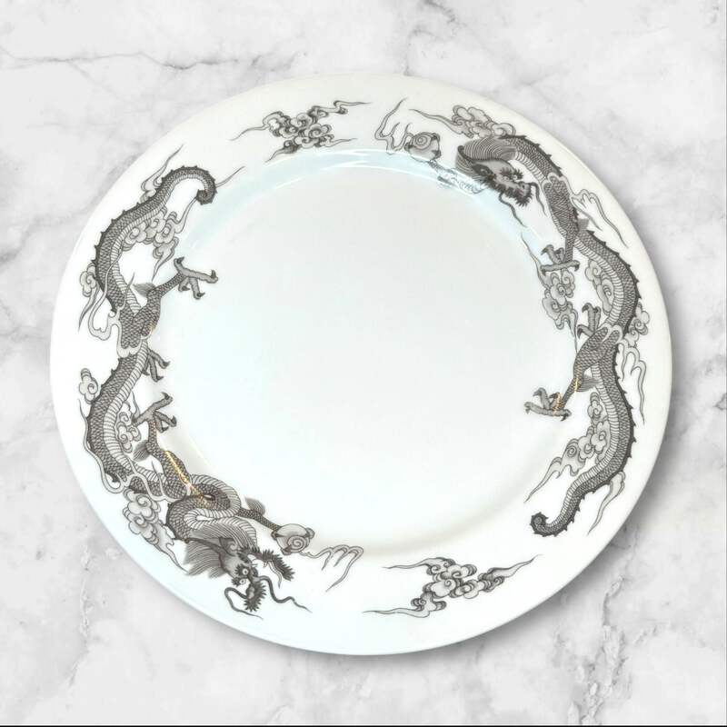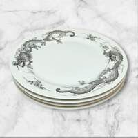 A rare and elegant set of 4 dessert plates featuring a dramatic dragon motif by Fukagawa for Tiffany & Co. These Japanese porcelain plates exude luxury and artistry.