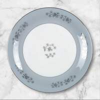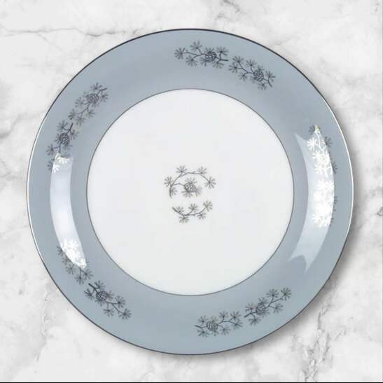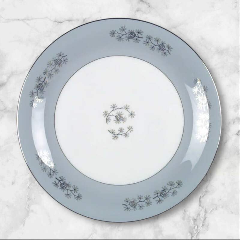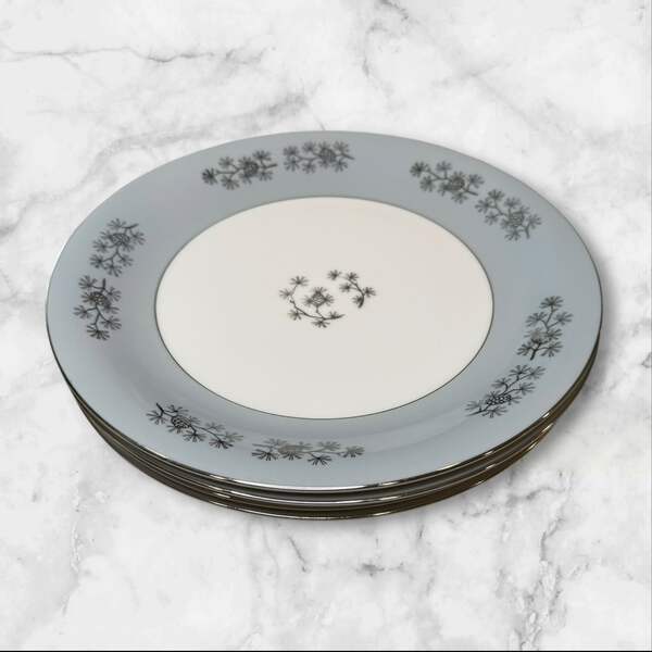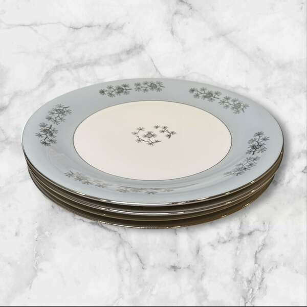 Elevate your table setting with these elegant 10.5” dinner plates from Seyei’s discontinued Silver Cone collection. A soft blue rim and silver floral design add timeless charm. All four plates are in excellent condition with no visible wear.