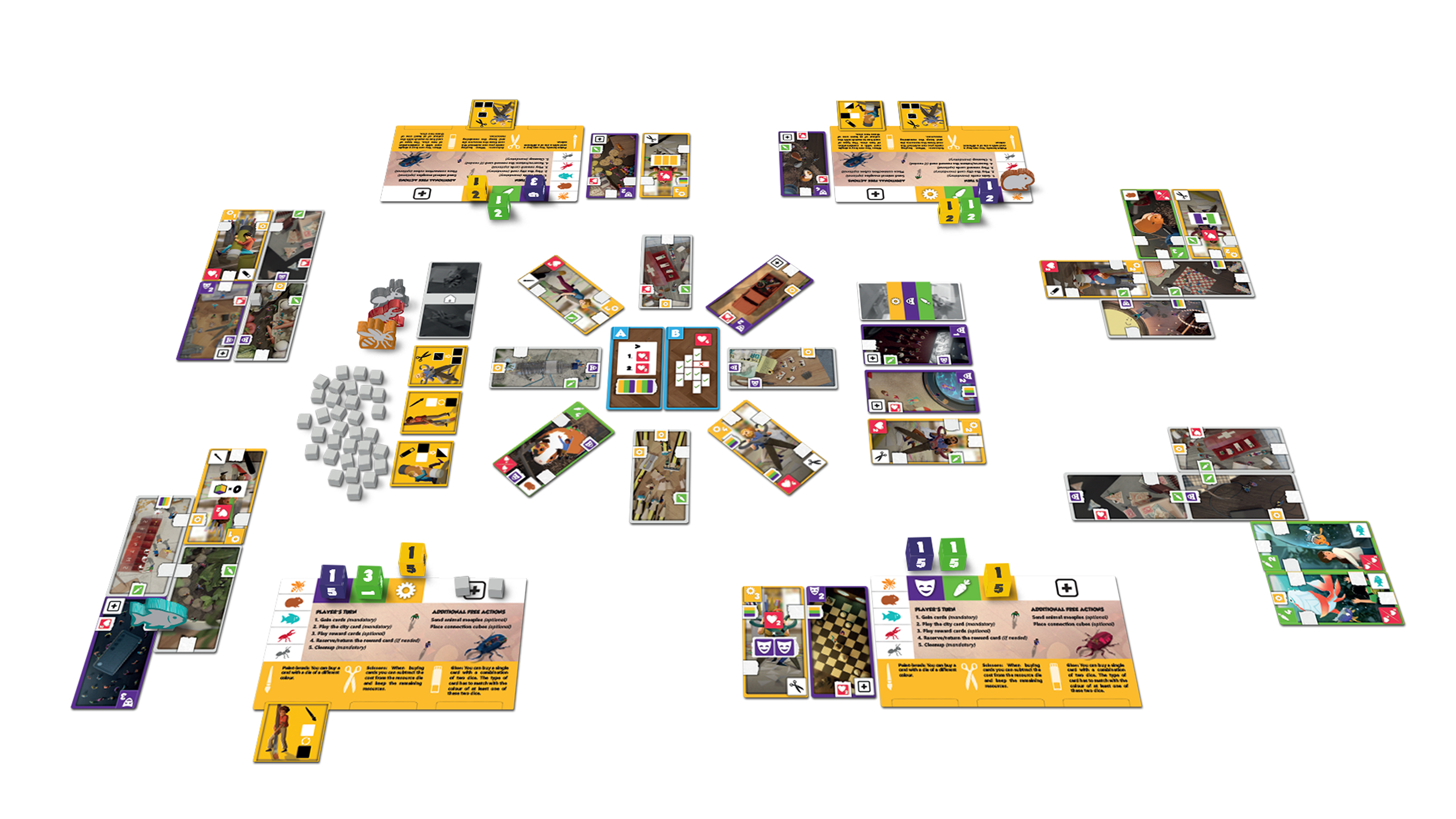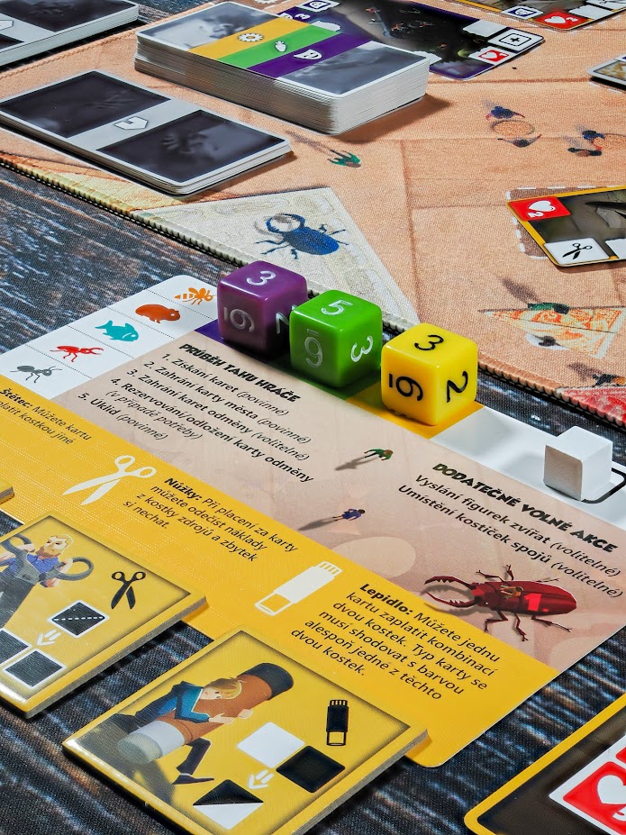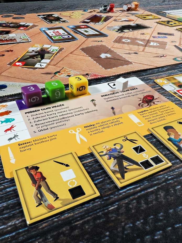 On your turn, choose two adjacent cards (a city card and a reward card) from the circular offer. Place one to expand your city and gather resource dice by creating connections with already placed cards. Then, optionally spend a specific die to get a reward card of the same color from the common or personal supply. Collecting different animals gives you cute meeples to share other players´ resources. Getting useful tools allows you to manipulate with resource dice. Build sets of the same type of cards to unlock even better actions and receive more points.
