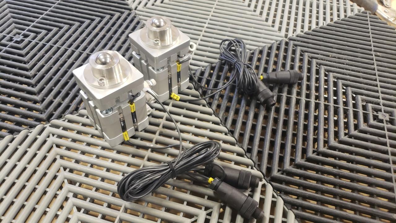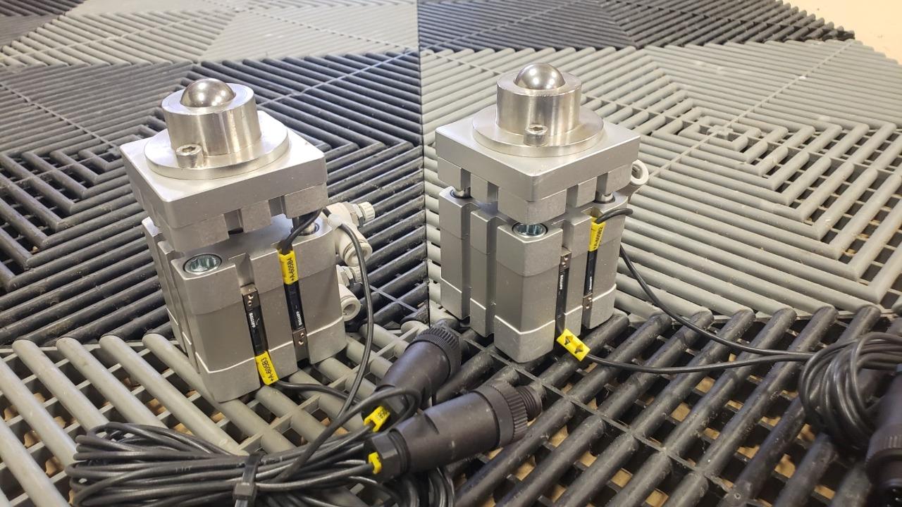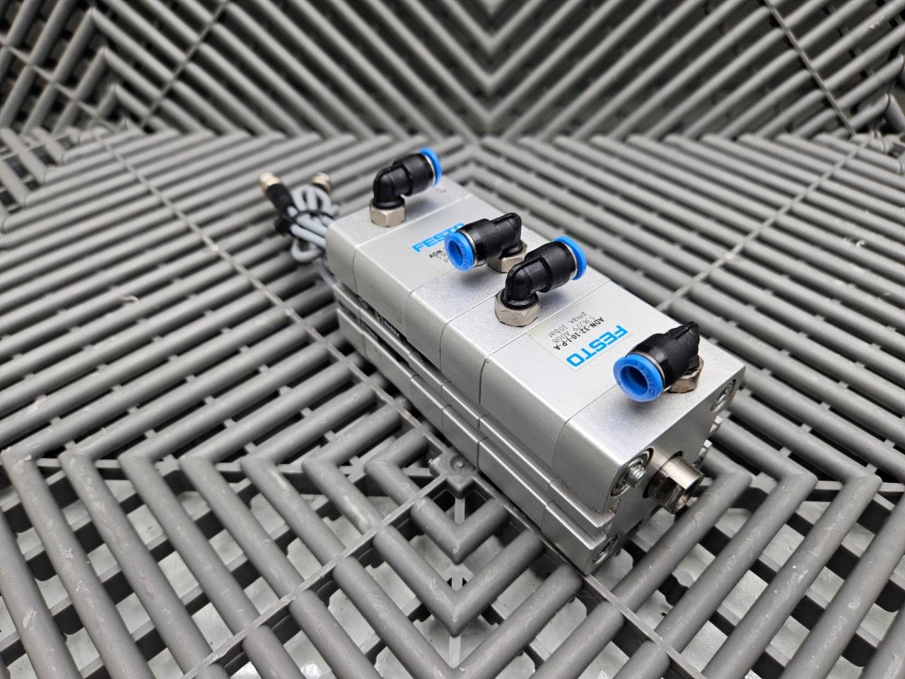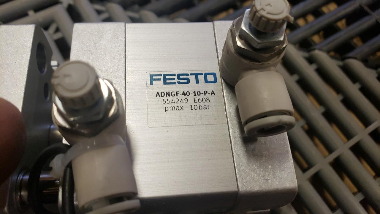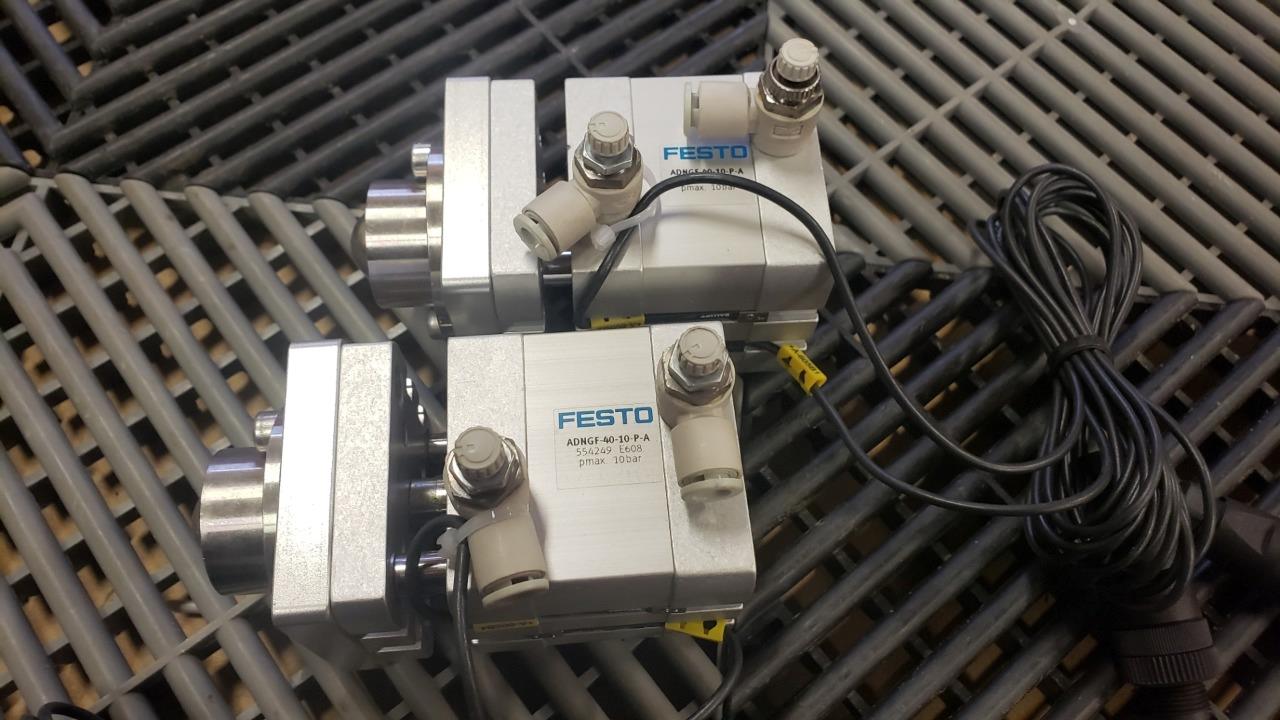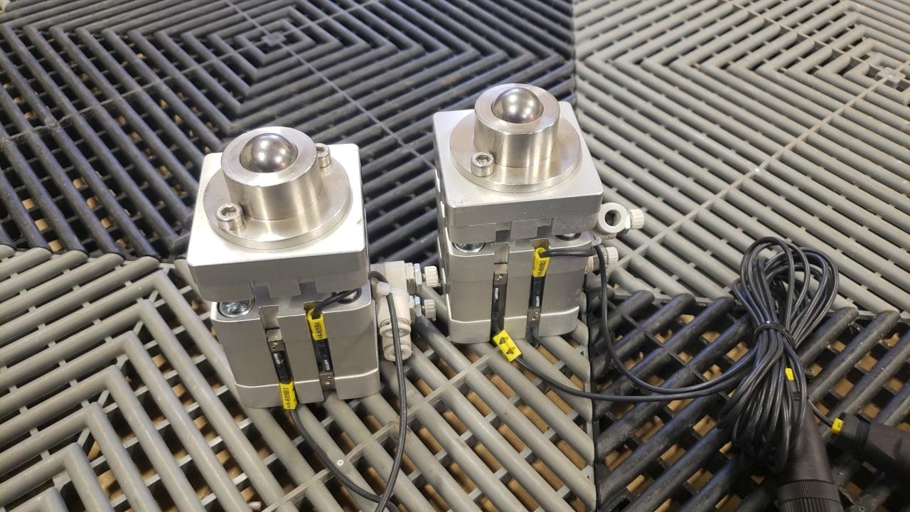 Here is a pair of Festo compact air cylinders. These have a 40mm bore and a 10mm stroke. These include removable ball transfer bearings up top. Both include extended and retracted Balluff limit switches as shown.