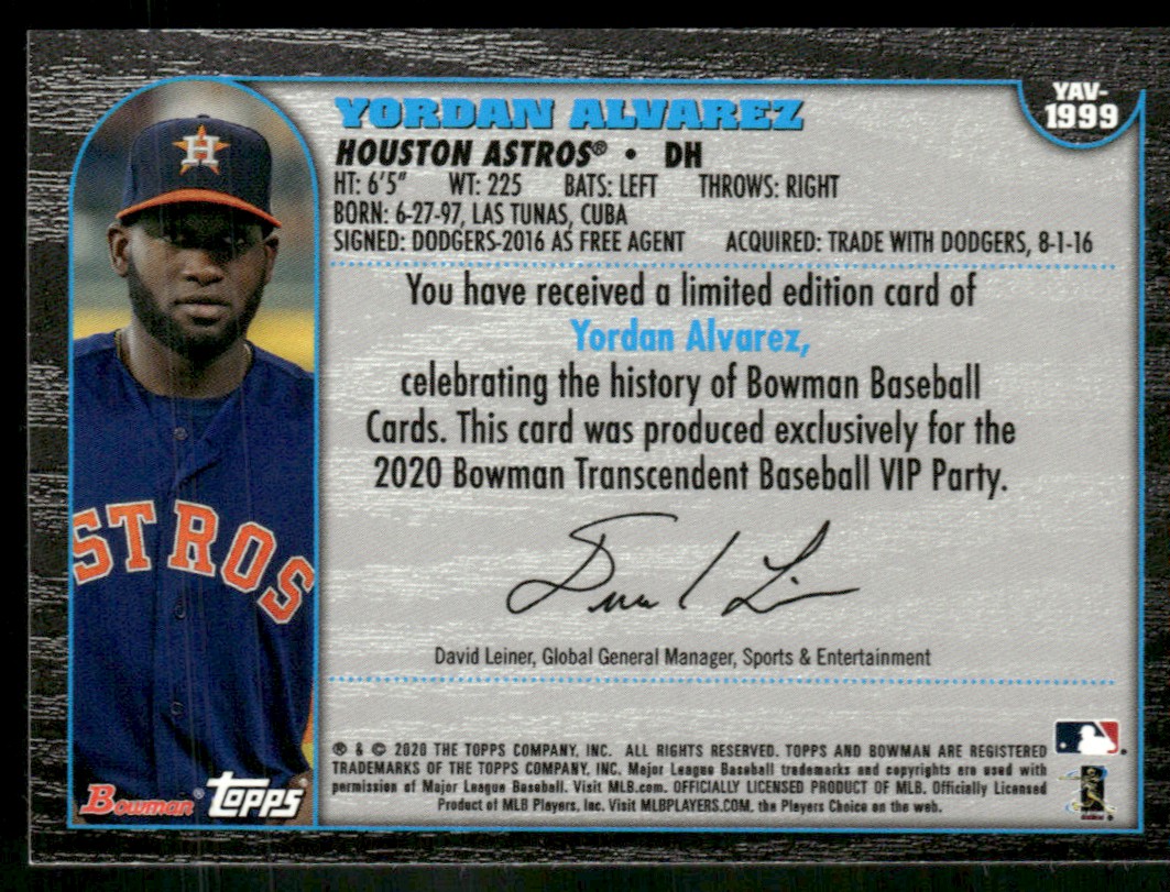 | 2020 Transcendent VIP Rookie The Years 16/50 Yordan Alvarez #YAV-1999 R6220J |