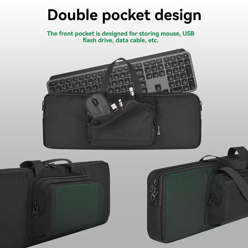 l Dual-pocket design with a front pocket for convenient storage of USB drives and mice