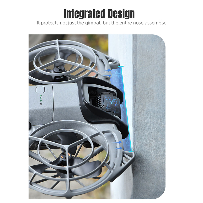 l Its distinctive curved profile remains out of frame, providing integrated protection for both gimbal and camera. It absorbs significant impact forces during drone crashes or collisions with walls or other objects, effectively reducing damage to the gimbal and lens