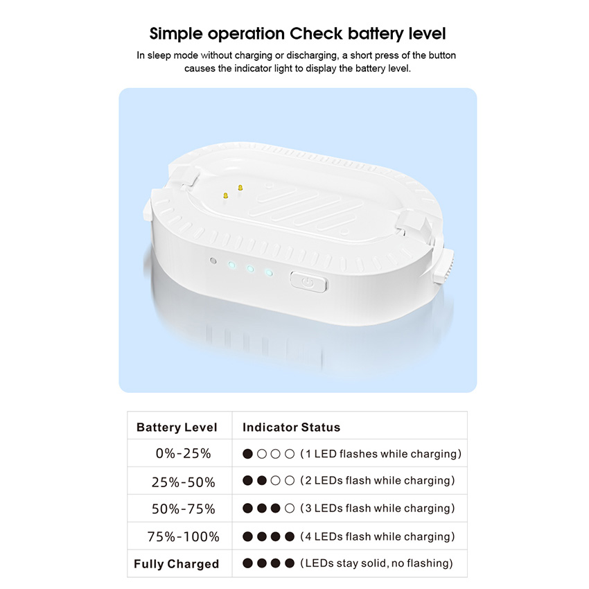 l Battery indicator for real-time status: Four built-in LED lights clearly display remaining power and charging status, helping you plan shooting duration and never miss a crucial moment