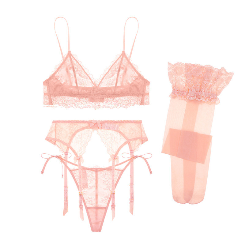 Sheer Lace Wire Free Bra Set with Garter Belt Stockings Sexy Lingerie