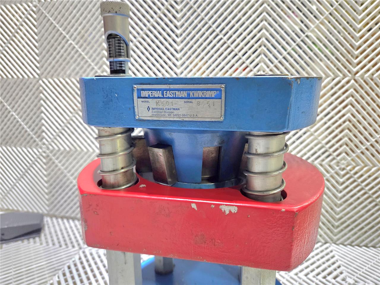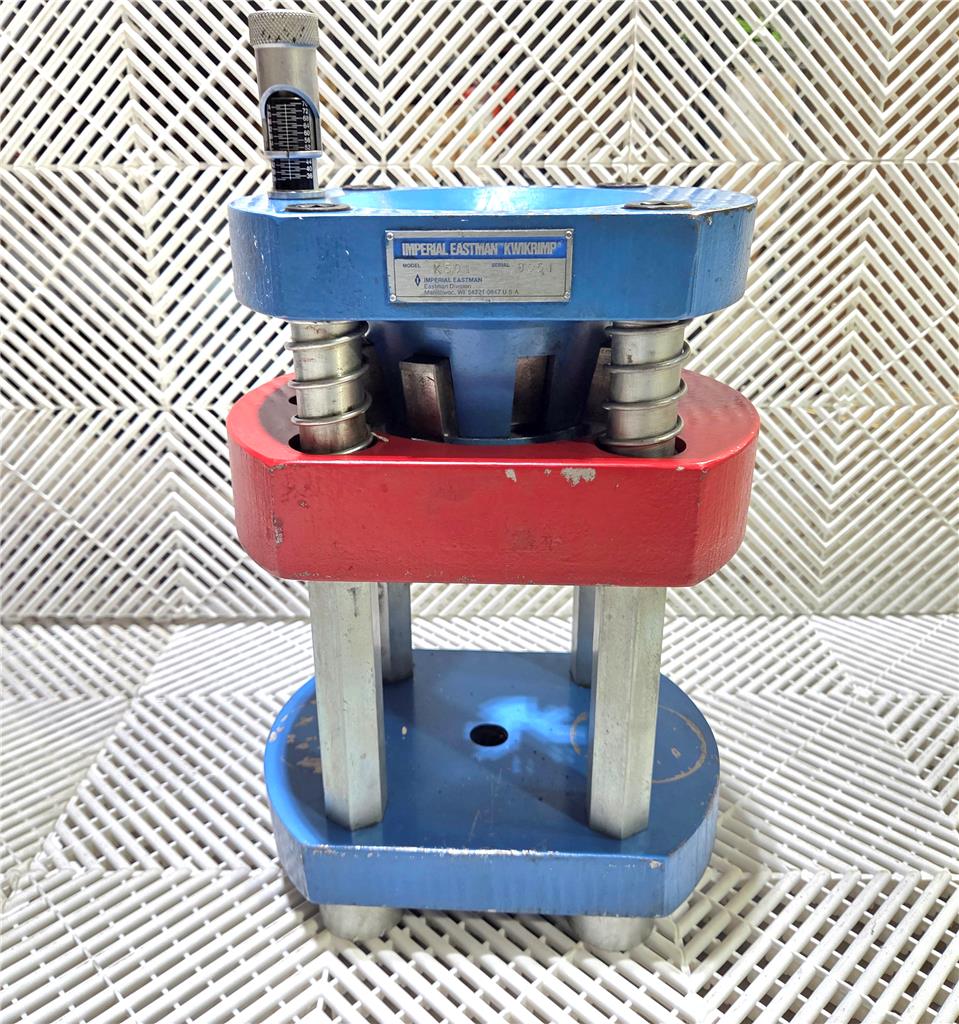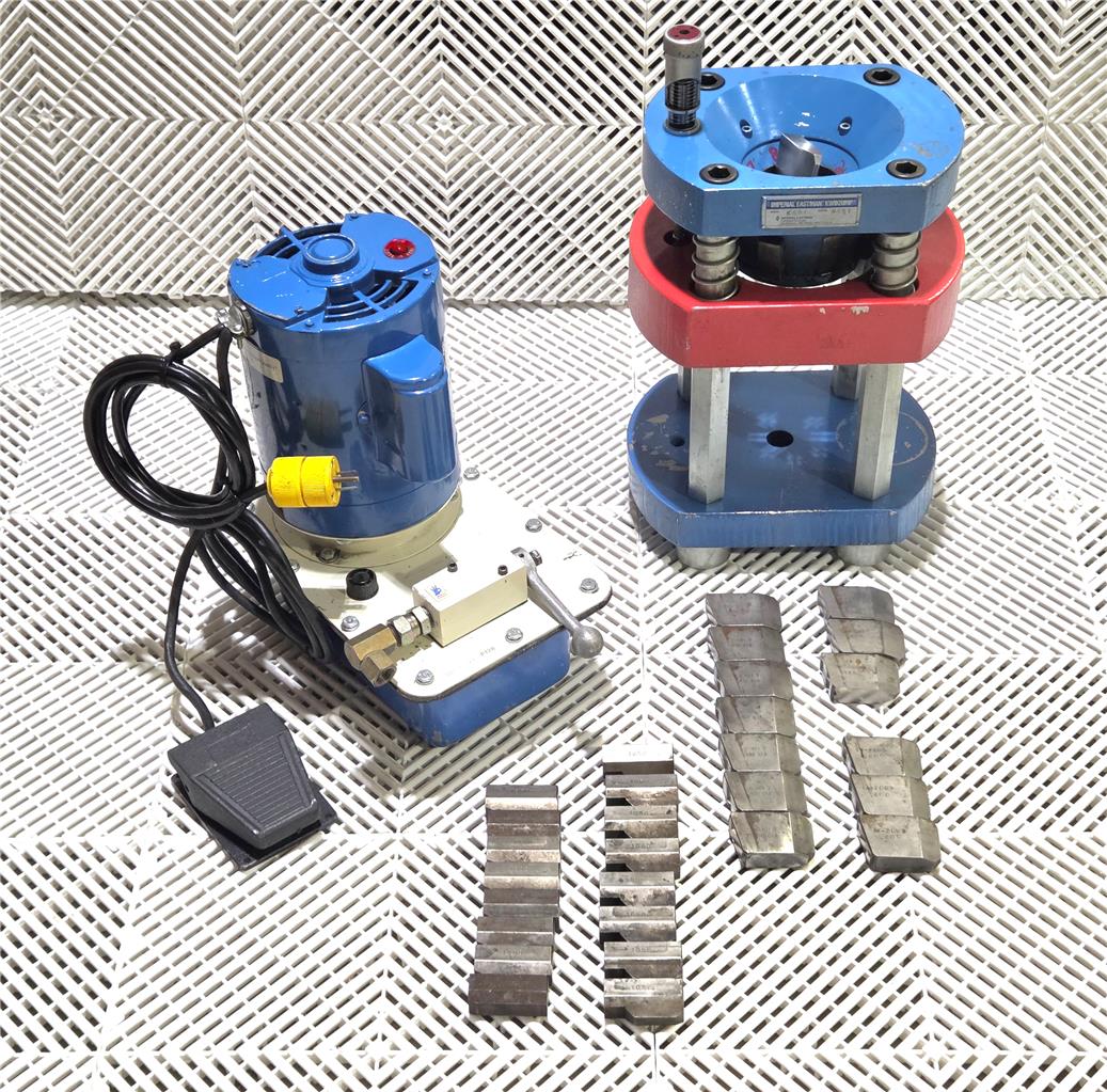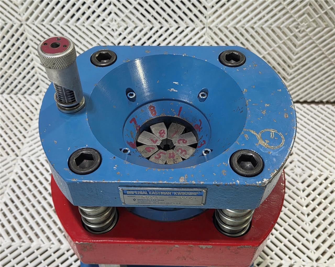 Here is an Imperial Eastman KWIKRIMP K501 8-Tooth Hydraulic Hose Crimping Machine. Press is in superb condition but is missing two crimping rams. In good condition with some exterior wear visible. Set includes the motor, foot pedal combo, crimping press, 3 complete sets of die (8 in each set), and 3 incomplete sets.