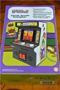 Brand New mini Arcade game. Cabinet stands 5 ½ inches tall (14.5 cm). Game features classic joystick action and authentic arcade sounds. Super Cute!