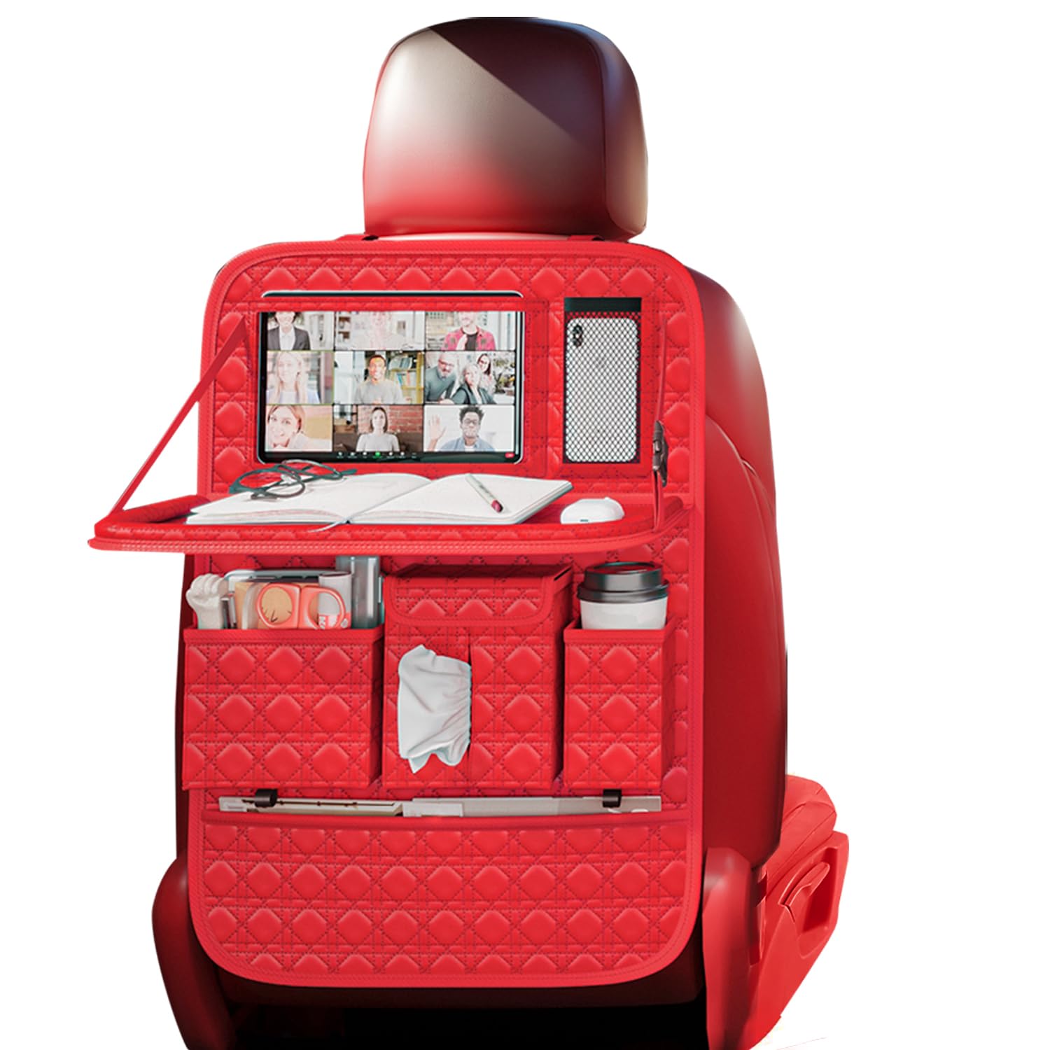 [3D Diamond Grid]-GMQ backseat car organizer use large 3D diamond grid pu leather, backseat car organizer with tray is controlled from material selection to manufacturing process, so that the seat back organizer can only store and organize items.