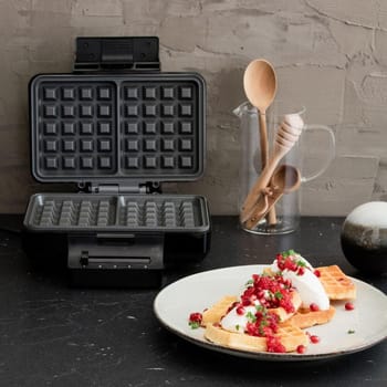 Das Waffeleisen Gaufres von Wilfa schenkt Ihnen dicke, flockige und knusprig belgische Waffeln. Diese Waffeln passen besonders gut zu Sirup, Schokolade und Eiscreme. Oder garnieren Sie sie einfach mit Schlagsahne und Beeren. Das Waffeleisen verfügt über ein 1000-Watt-Heizelement. Dank des verstellbaren Thermostats brät es gleichmäßig und Sie können selbst zwischen einem hellen, mittleren oder dunklen Ergebnis wählen. Gaufres zaubert zwei Waffeln gleichzeitig. Das Eisen verfügt über eine doppelte Antihaftbeschichtung. Dadurch ist es einfach zu reinigen, lange haltbar und die Waffeln lassen sich leicht ablösen. Gaufres kann platzsparend aufrechtstehend gelagert werden. Die Backzeit lässt sich optimal kontrollieren dank der Backampel des Waffeleisens. Zur Aufbewahrung können Sie das Waffeleisen platzsparend aufrecht lagern.