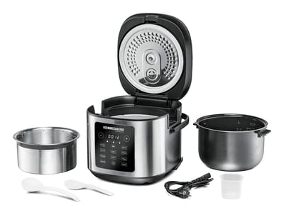 - Inklusive: Edelstahl Dämpfeinsatz, Servier- und Suppenlöffel, Messbecher, abnehmbares Netzkabel