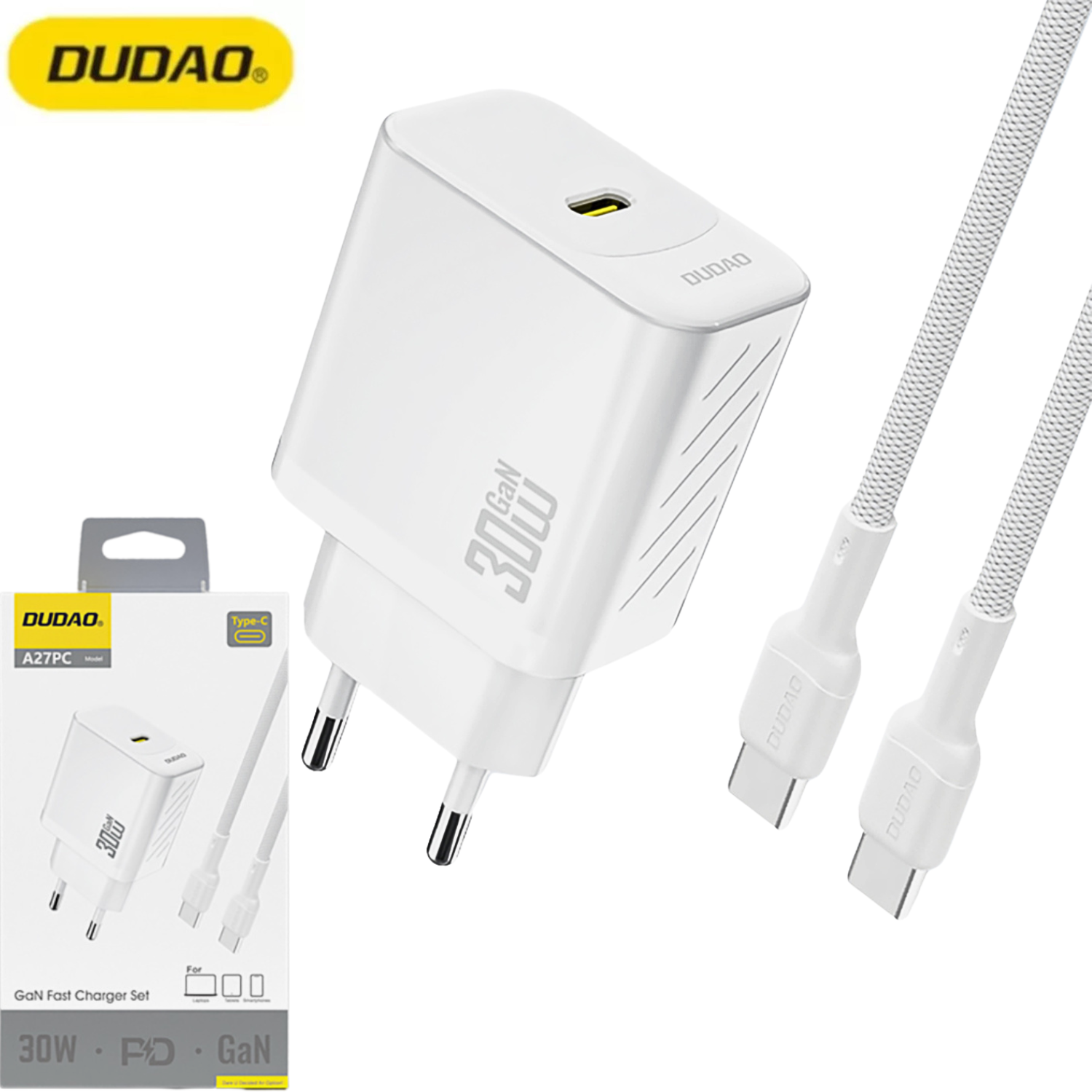 Das Netzladegerät Dudao A27PCEU PD 30 W GaN USB-C ist eine kompakte und moderne Lösung zum schnellen Laden mobiler Geräte. Dank der GaN-Technologie und einer Leistung von bis zu 30 W bietet es effiziente und stabile Stromversorgung bei geringer Gehäusegröße. Der einzelne USB-C-Port mit Power Delivery passt die Ladeparameter intelligent an das angeschlossene Gerät an. Die rutschfeste Textur verbessert den Nutzungskomfort und die Griffsicherheit. Es ist eine praktische Wahl für den täglichen Gebrauch und Reisen. Spezifikation: - Marke: Dudao - Modell: Dudao A27PCEU - Typ: Netzladegerät GaN - Eingang: AC - Ausgang: USB-C 5 V = 3 A; 9 V = 3 A; 12 V = 2,5 A; 15 V = 2 A; 20 V = 1,5 A - Maximale Leistung: 30 W - Anschlüsse: USB-C - Lieferumfang: Ladegerät, USB-C zu USB-C Kabel - Material: Kunststoff mit rutschfester Textur - Farbe: weiß Hauptvorteile des Ladegeräts Dudao A27PCEU: - Schnelles Laden PD 30 W: effiziente Stromversorgung kompatibler Geräte über USB-C. - GaN-Technologie: hohe Effizienz und kompakte Bauweise. - Ein USB-C Ausgang: einfache und moderne Lösung für das tägliche Laden. - Rutschfeste Textur: sicherer Griff und größerer Nutzungskomfort. - USB-C Kabel im Lieferumfang: bereit zum Laden ohne zusätzliche Zubehörteile. Power Delivery 30 W: - Der USB-C-Port passt Spannung und Stromstärke automatisch an das angeschlossene Gerät an. GaN-Technologie: - Galliumnitrid reduziert die Wärmeentwicklung und hält eine hohe Ladeeffizienz aufrecht. Kompakte Form: - Die geringen Abmessungen machen das Ladegerät ideal für Reisen und den täglichen Gebrauch. Rutschfeste Gehäuse: - Die spezielle Textur erhöht die Sicherheit und den Bedienkomfort. USB-C zu USB-C Kabel im Lieferumfang: - Das mitgelieferte Kabel ermöglicht das sofortige Laden nach dem Anschließen.