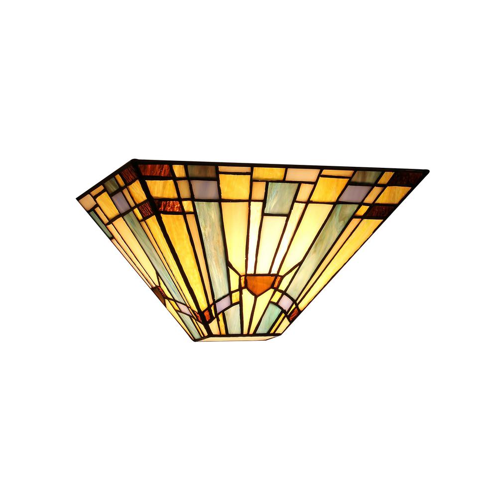 KINSEY, a beautifully Mission style hand-crafted wall mount sconce with intricate designed and cut glass shade. Lamp shade design features multi-toned antique colored pieces accented with a row of matching cut circles. Coated in an antique bronze patina tone. Expertly crafted with top quality materials.