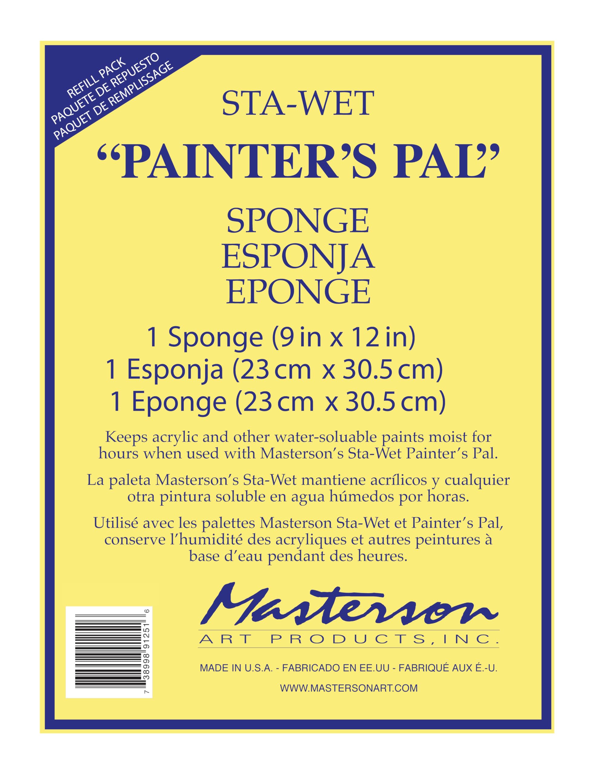 The Masterson Sta-Wet Painter’s Pal Palette Sponge Refill is compatible with the Masterson Sta-Wet Painter’s Pal Palette. The sponge is designed to be used in combination with the Masterson Sta-Wet Acrylic Palette Paper (not included) to provide moisture for the Sta-Wet system. The sponge is reusable. When moistened and used in the Sta-Wet system, the sponge keeps acrylics and other water-soluble paints workable for days and even weeks. The Sta-Wet Painter’s Pal Sponge Refill includes 1 sponge. Please be sure to follow all sponge preparation instructions provided. Made in the USA.
